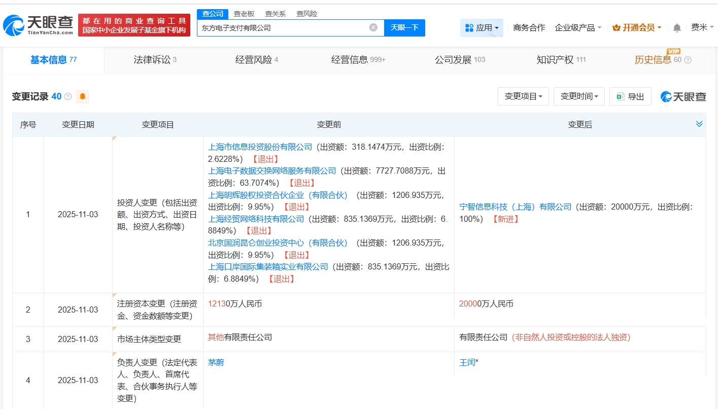 雷达财经讯,天眼查工商信息显示,近日,东方电子支付有限公司发生工商变更,原股东上海市信息投资股份有限公司、上海电子数据交换网络服务有限公司等退出,新增小红书旗下宁智信息科技(上海)有限公司为全资股东,茅蔚卸任法定代表人、董事长,王闰接任法定代表人并担任董事,注册资本由约1.21亿人民币增至2亿人民币。同时,多位主要人员发生变更。