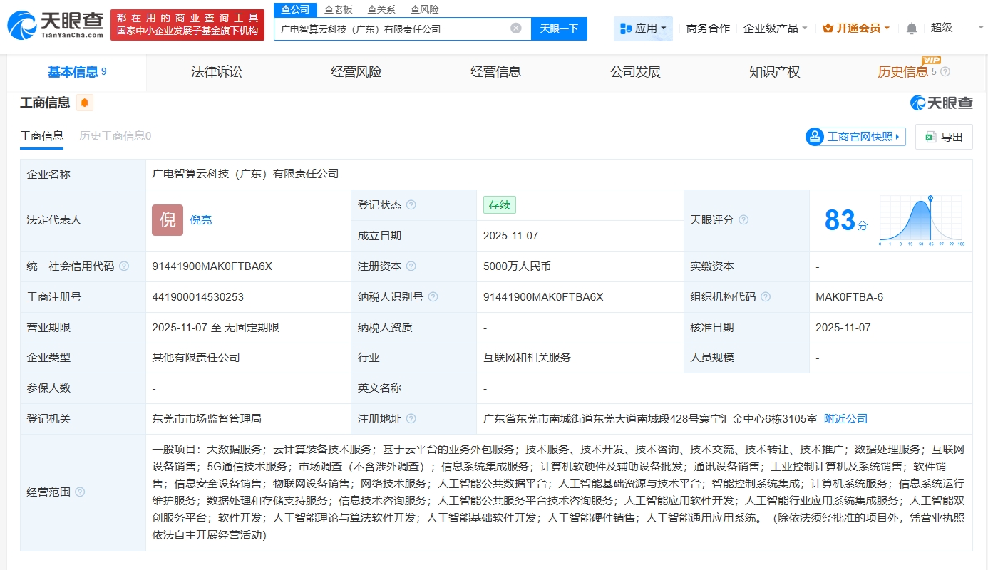 雷达财经讯,天眼查工商信息显示,近日,广电智算云科技(广东)有限责任公司成立,法定代表人为倪亮,注册资本5000万人民币,经营范围包括大数据服务、云计算装备技术服务、基于云平台的业务外包服务等。股东信息显示,该公司由广东弘展大数据有限公司、开普云(688228)、成都元书坊科技有限公司共同出资。