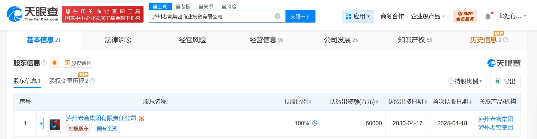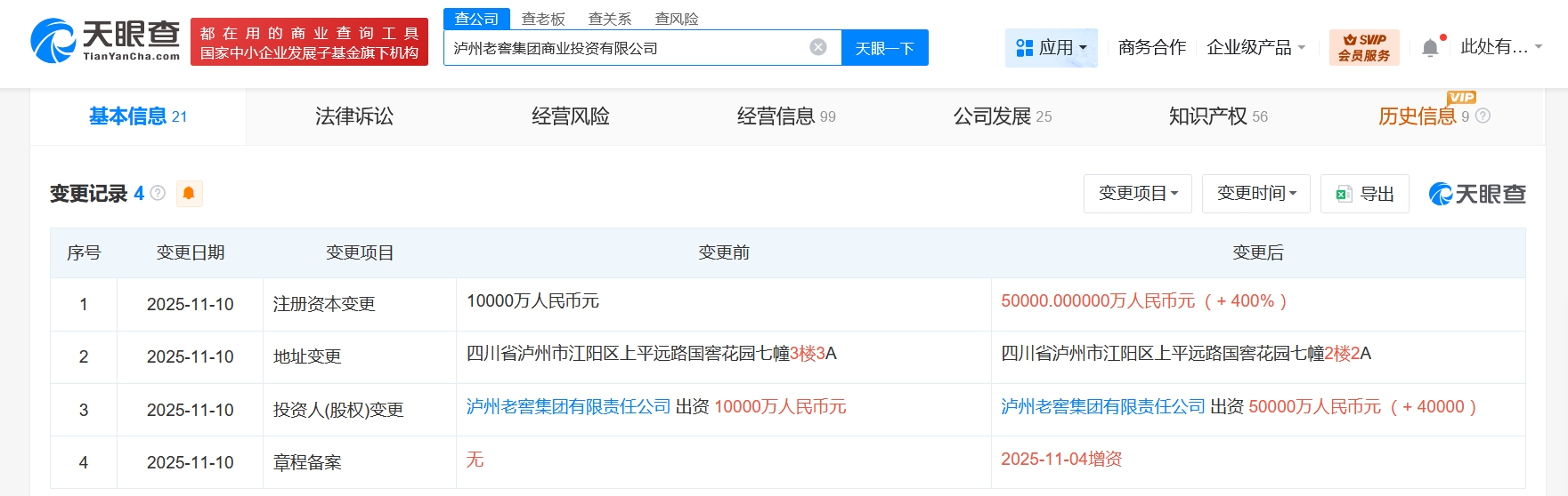 天眼查工商信息显示,近日,泸州老窖集团商业投资有限公司发生工商变更,注册资本由1亿人民币增至5亿人民币,增幅400%…