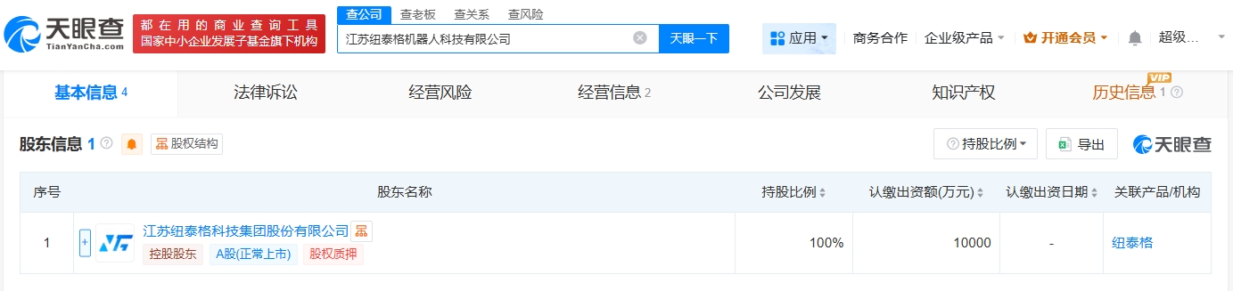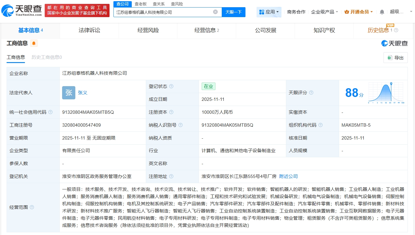 雷达财经讯,天眼查App显示,近日,江苏纽泰格机器人科技有限公司成立,法定代表人为张义,注册资本1亿人民币,经营范围包括软件开发、软件销售、智能机器人的研发、工业机器人制造等。股东信息显示,该公司由纽泰格(301229)全资持股。