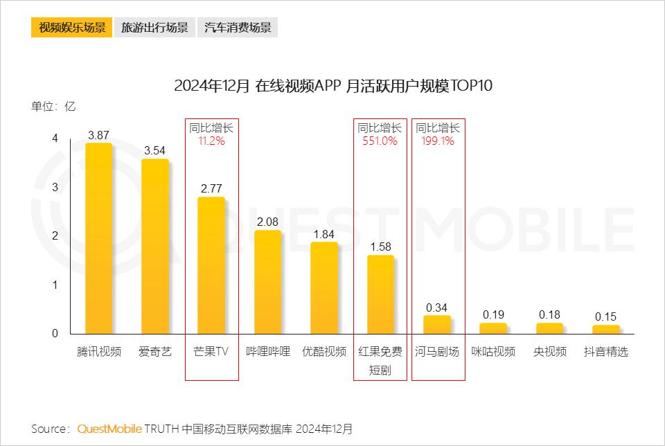 据第三方机构QuestMobile发布的数据,在APP上线不到一年后的2024年3月,红果短剧以5400万的月活跃用户数跻身在线视频行业第六,但其长达约1.38小时的月人均单日使用时长,却超过爱奇艺、优酷、腾讯视频、芒果TV四大长视频平台。