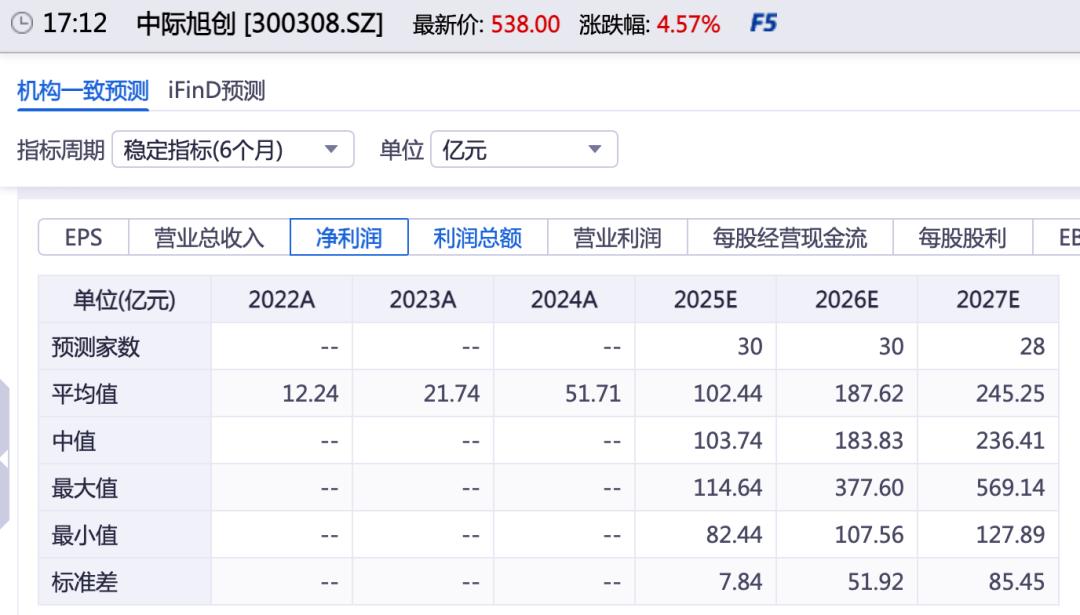 同花顺iFind显示,截至12月1日,28家机构对中际旭创2027年的归母净利润给出了预测,平均值为245.25亿元,其中最大值甚至高达569.14亿元。