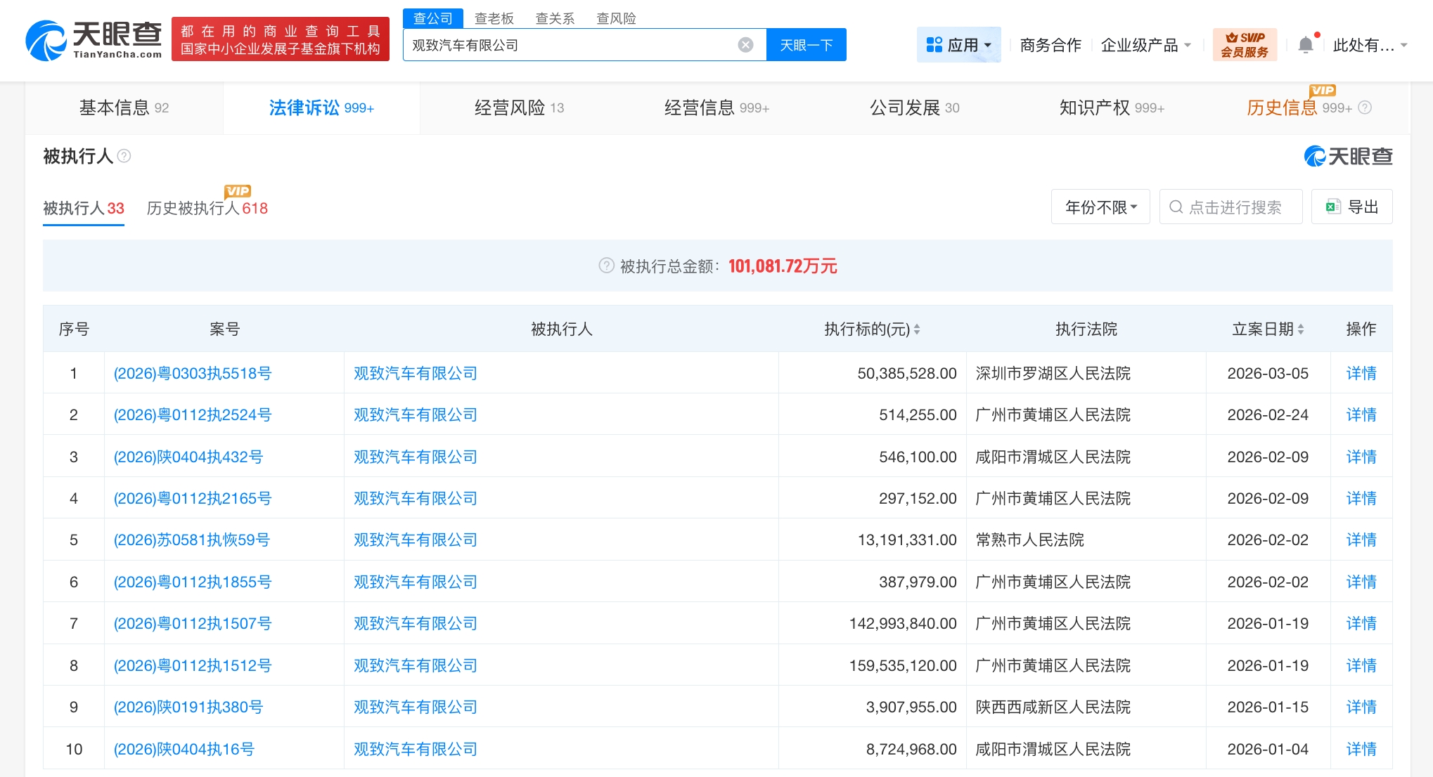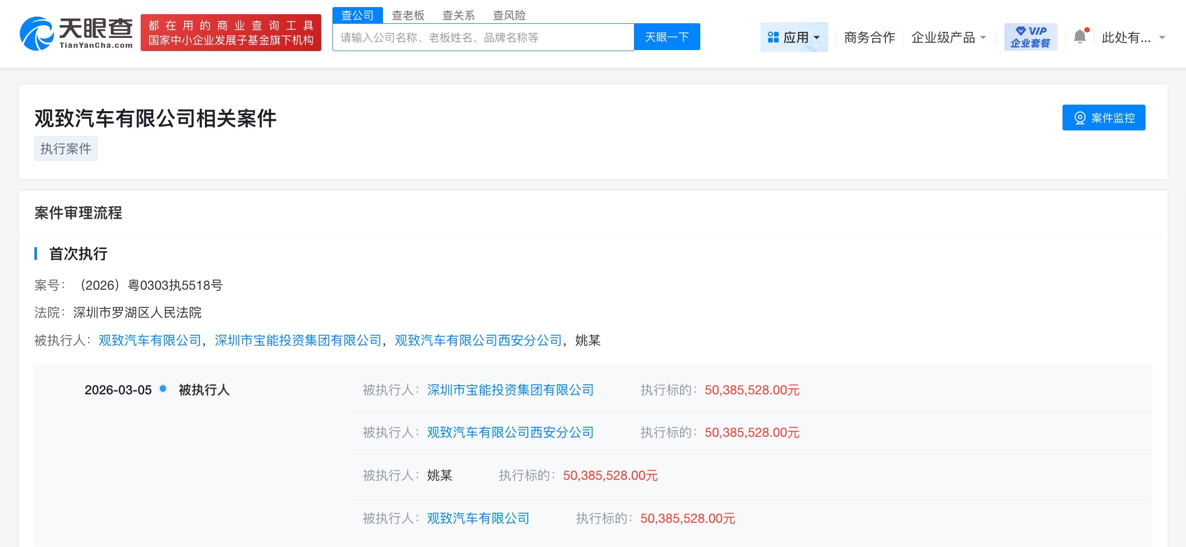 雷达财经讯,天眼查法律诉讼信息显示,近日,观致汽车有限公司、姚振华等新增一则被执行人信息,执行金额5038万余元,执行法院为广东省深圳市罗湖区人民法院。 观致汽车有限公司成立于2007年12月,法定代表人为何华,注册资本约169.3亿人民币,经营范围包括观致品牌机动车辆的生产、销售等。股东信息显示,该公司由杭州诚茂投资有限公司、芜湖奇瑞汽车投资有限公司、Quantum(2007)LLC共同持股。天眼风险信息显示,该公司现存33条被执行人信息,被执行总金额超10亿元,此外,该公司还存在多条限制消费令、失信被执行人(老赖)及终本案件信息。