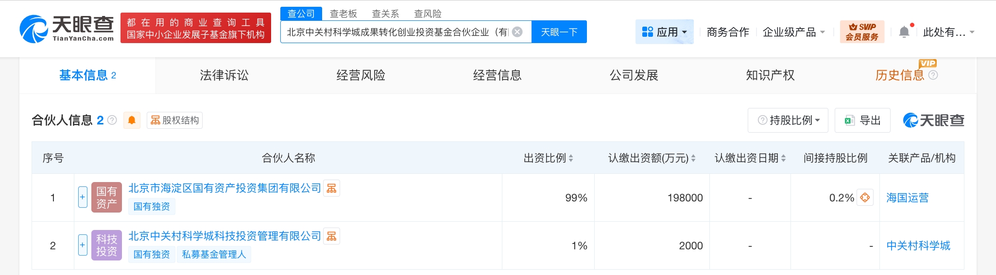 雷达财经讯,天眼查工商信息显示,近日,北京中关村科学城成果转化创业投资基金合伙企业(有限合伙)成立,执行事务合伙人为北京中关村科学城科技投资管理有限公司,出资额20亿人民币,经营范围为私募股权投资基金管理、创业投资基金管理服务。合伙人信息显示,该基金由北京市海淀区国有资产投资集团有限公司、北京中关村科学城科技投资管理有限公司共同出资。