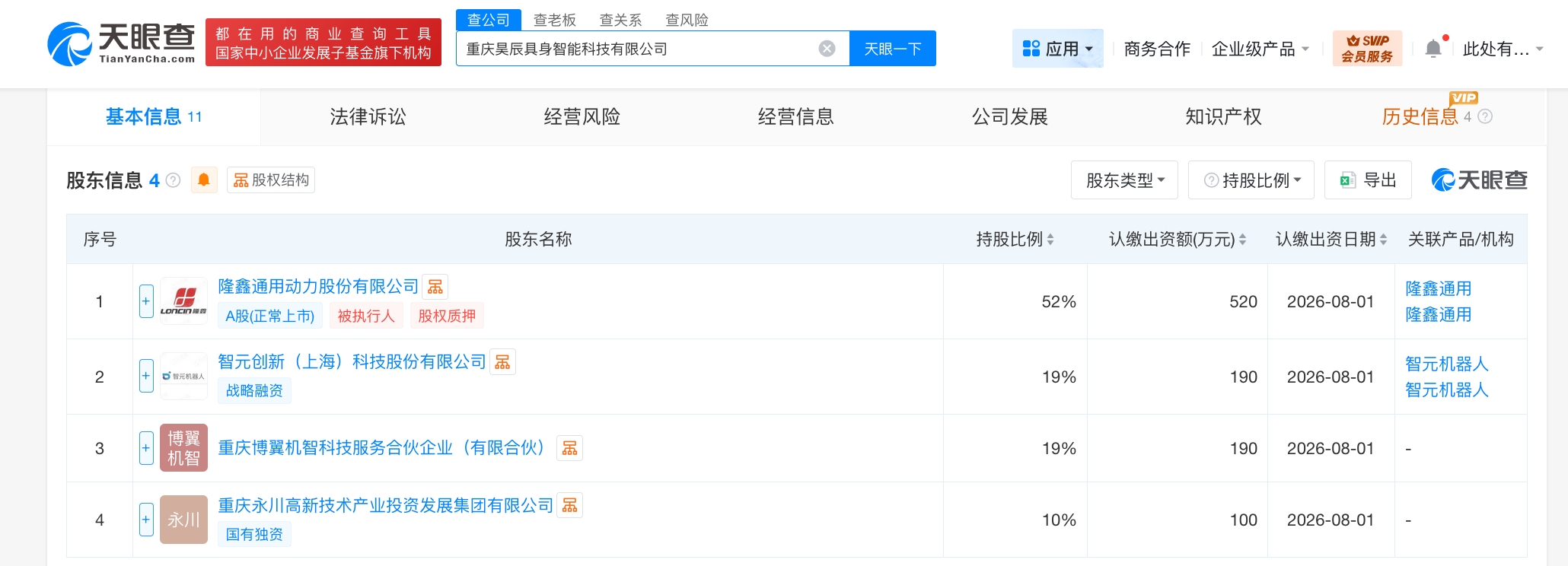 雷达财经讯,天眼查工商信息显示,近日,重庆昊辰具身智能科技有限公司成立,法定代表人为李科,注册资本1000万人民币,经营范围包括智能机器人的研发、工业机器人制造、人工智能理论与算法软件开发、服务消费机器人制造等。股东信息显示,该公司由隆鑫通用(603766)、智元机器人关联公司智元创新(上海)科技股份有限公司、重庆博翼机智科技服务合伙企业、重庆永川高新技术产业投资发展集团有限公司共同持股。