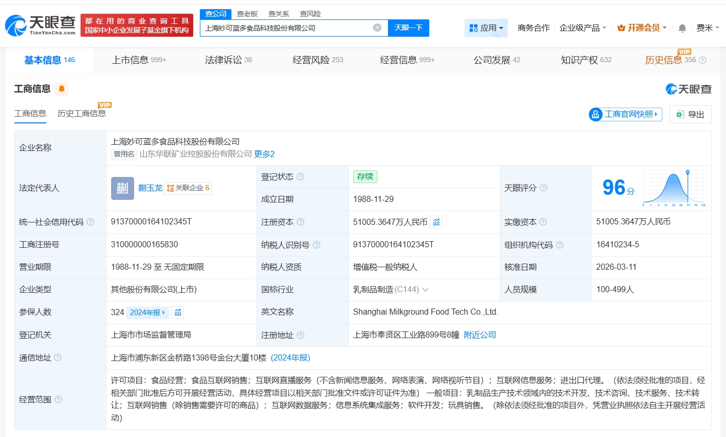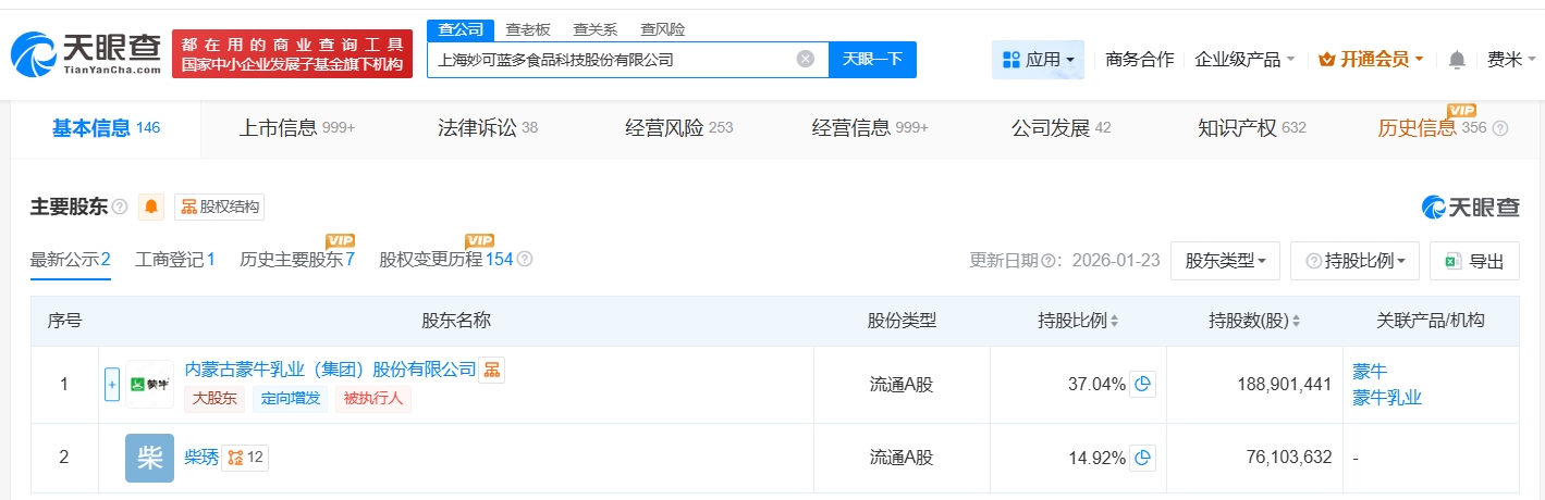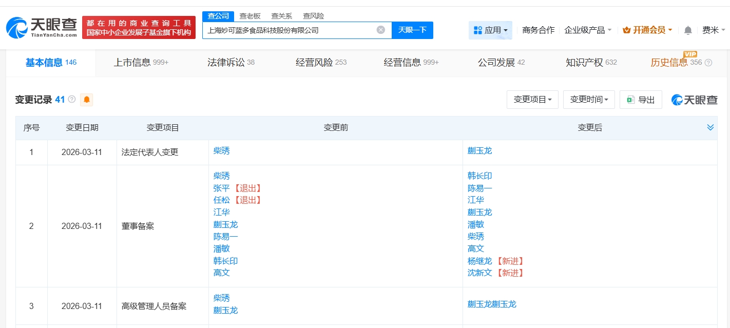 雷达财经讯,天眼查工商信息显示,近日,妙可蓝多(600882)发生工商变更,创始人柴琇卸任法定代表人,由蒯玉龙接任。 上海妙可蓝多食品科技股份有限公司成立于1988年11月,注册资本约5.1亿人民币,经营范围包括食品经营、食品互联网销售、互联网直播服务等。股东信息显示,该公司由内蒙古蒙牛乳业(集团)股份有限公司、柴琇等共同持股。