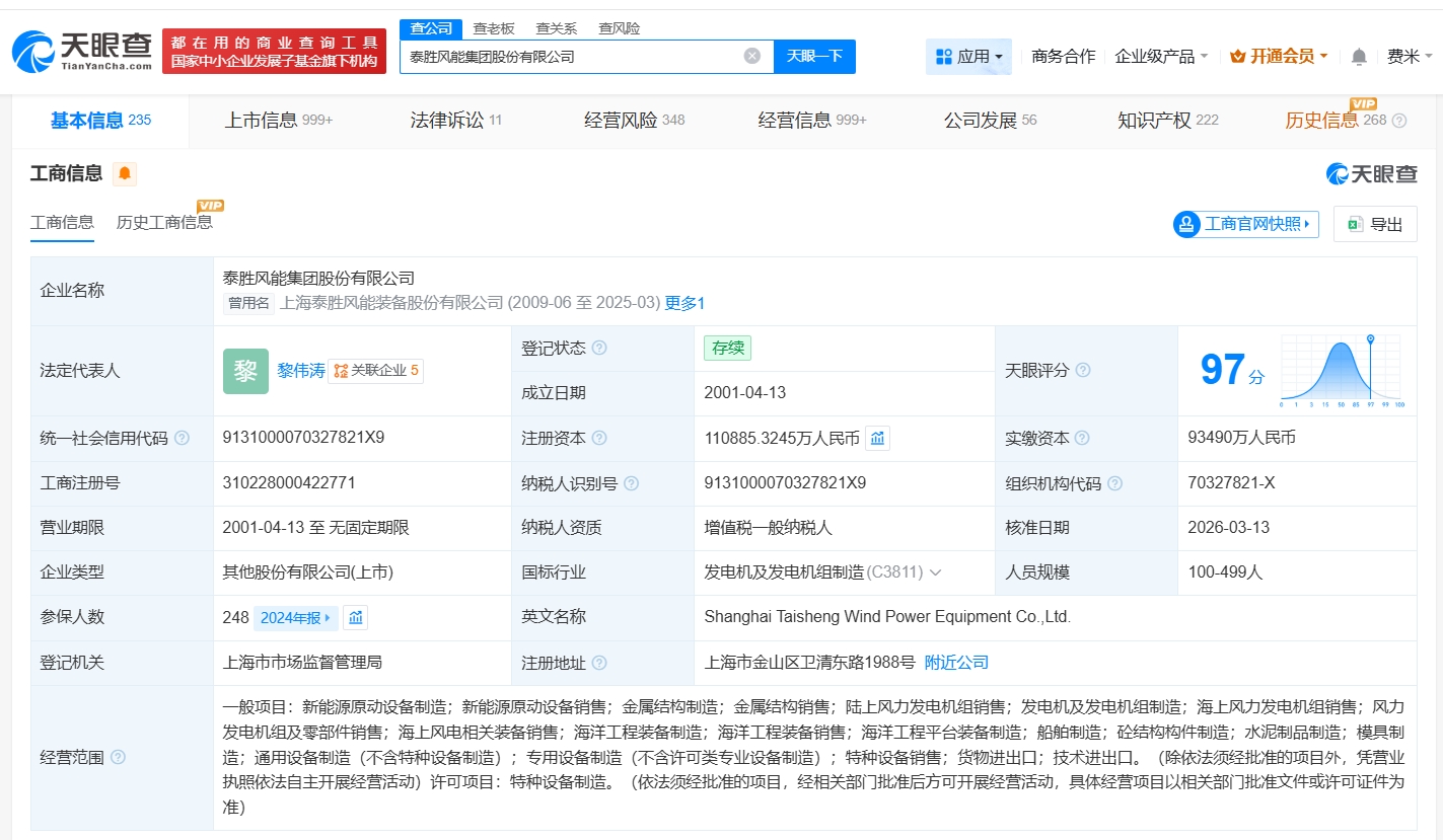 雷达财经讯,天眼查工商信息显示,近日,上海电力绿色能源有限公司发生工商变更,注册资本由约5.1亿人民币增至约6.8亿人民币,增幅约32%。 该公司成立于2014年6月,法定代表人为叶青,经营范围包括新能源及分布式能源科技、环保科技、节能技术领域内的技术咨询、技术开发、技术服务、技术转让,太阳能发电技术服务等。股东信息显示,该公司由上海电力(600021)全资持股。