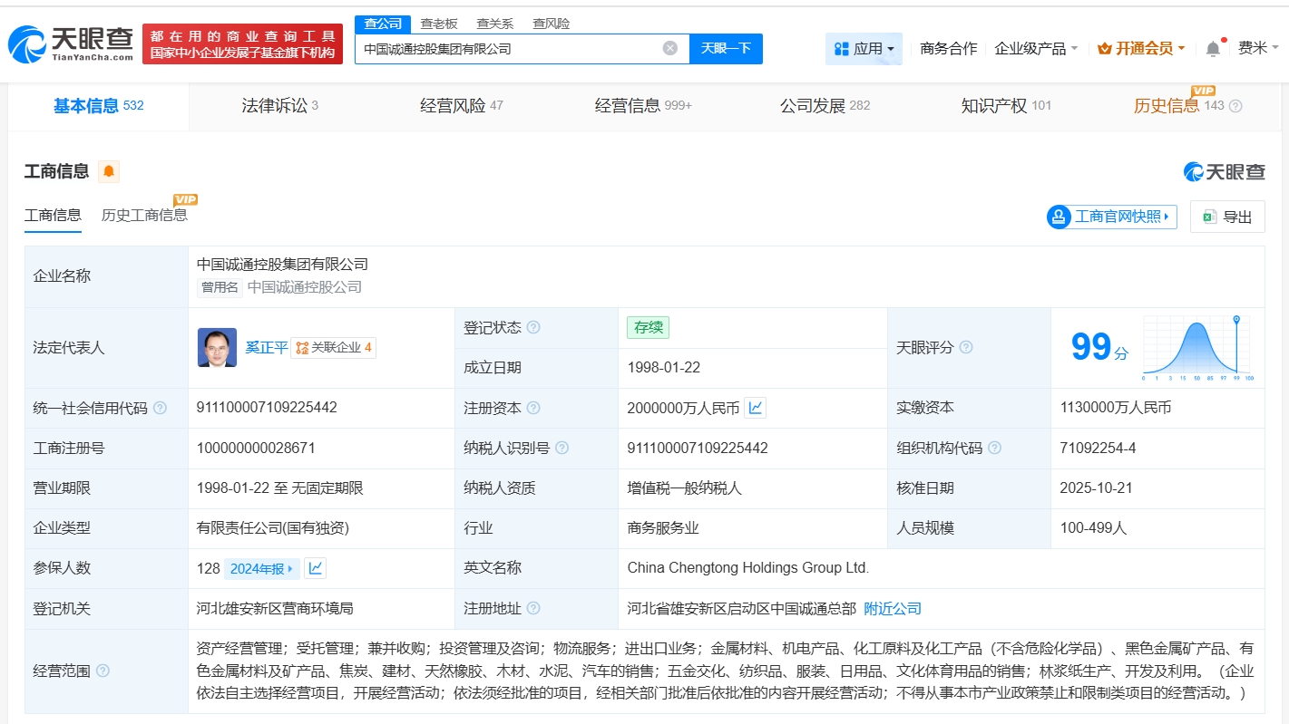 雷达财经讯,天眼查App显示,近日,中国诚通控股集团有限公司发生工商变更,注册资本由113亿人民币增至200亿人民币,增幅约77%,同时发生高管变更。