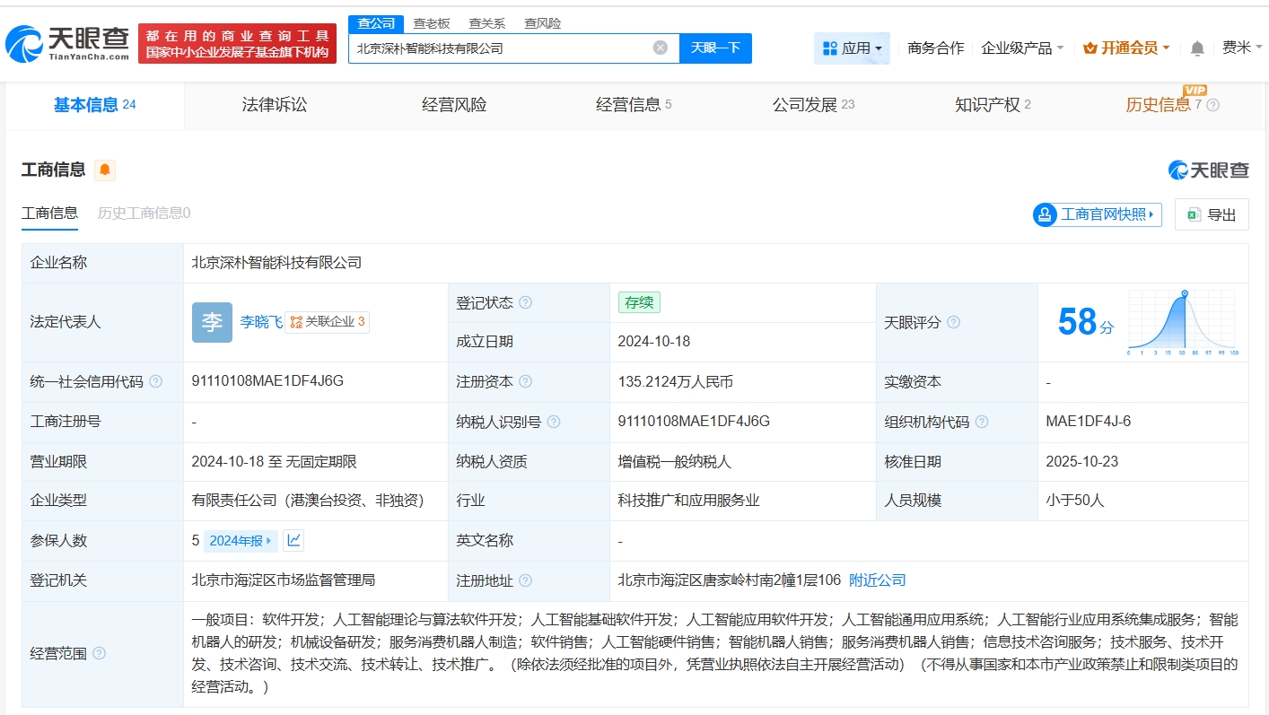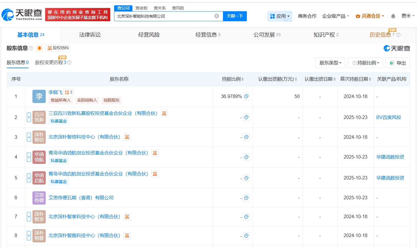 北京深朴智能科技有限公司成立于2024年10月,法定代表人为李晓飞,经营范围包括人工智能理论与算法软件开发、人工智能基础软件开发、人工智能应用软件开发等,现由李晓飞、北京深朴智信科技中心(有限合伙)及上述新增股东等共同持股。公开资料显示,该公司是一家专注于“机器人+AI模型”技术落地的创新型科技企业。