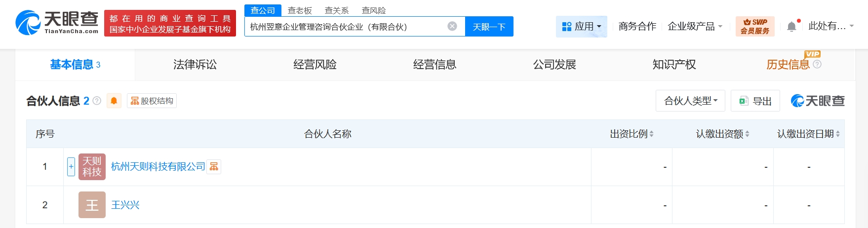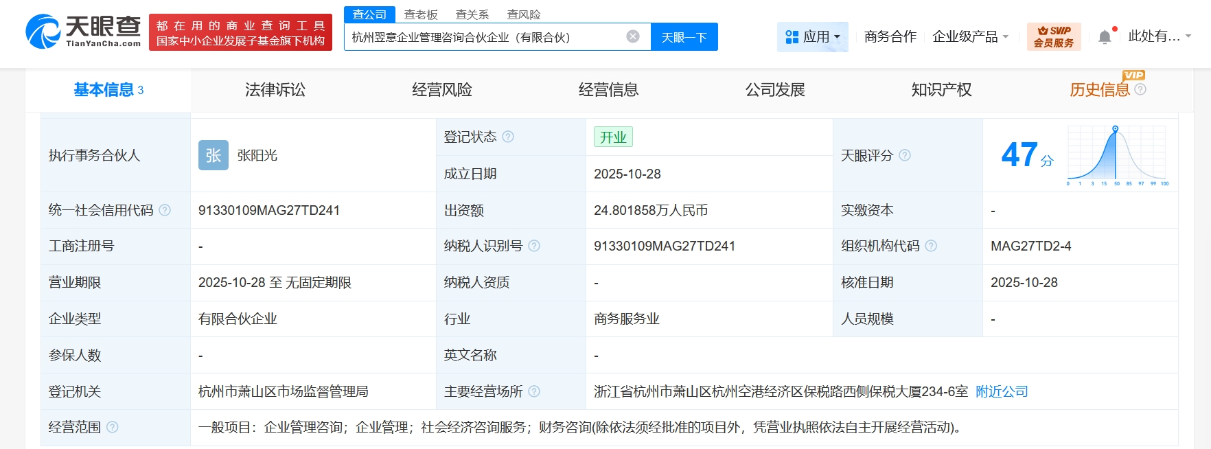 雷达财经讯,天眼查App显示,近日,杭州翌意企业管理咨询合伙企业(有限合伙)成立,执行事务合伙人为张阳光,出资额约24.8万人民币,经营范围为企业管理咨询、企业管理、社会经济咨询服务、财务咨询。合伙人信息显示,该企业由王兴兴及名下杭州天则科技有限公司共同出资。