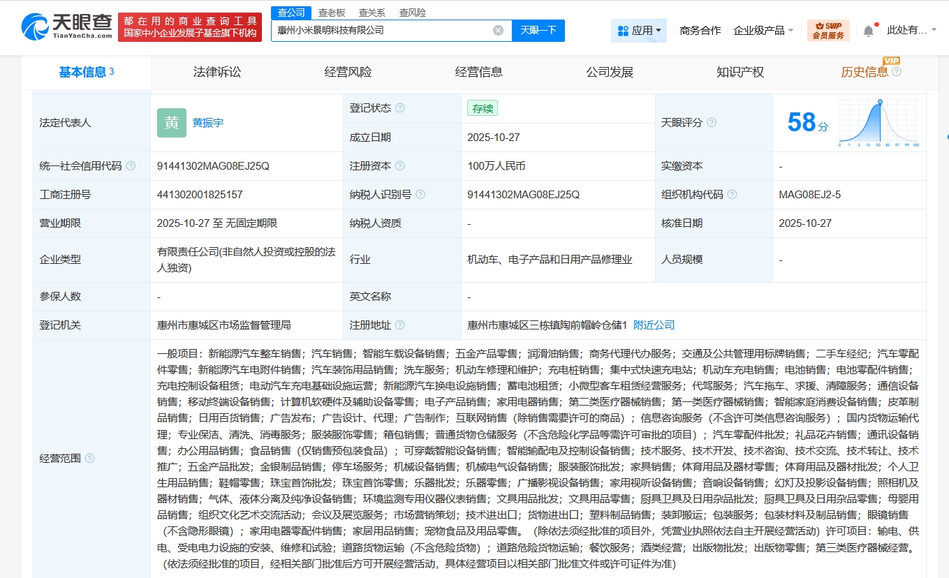 雷达财经讯,天眼查App显示,近日,惠州小米景明科技有限公司成立,法定代表人为黄振宇,注册资本100万人民币,经营范围含新能源汽车整车销售、汽车销售、智能车载设备销售、二手车经纪、汽车零配件零售、新能源汽车电附件销售、汽车装饰用品销售、机动车修理和维护、充电桩销售等,由小米景明科技有限公司全资持股。
