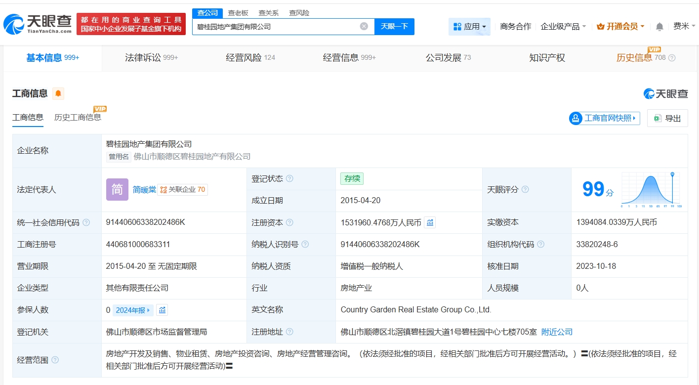 碧桂园地产集团有限公司成立于2015年4月,法定代表人为简暖棠,注册资本约153.2亿人民币,经营范围包括房地产开发及销售、物业租赁、房地产投资咨询等。股东信息显示,该公司由佛山市顺德区宙华投资咨询有限公司、深圳市碧桂科技发展有限公司共同持股。