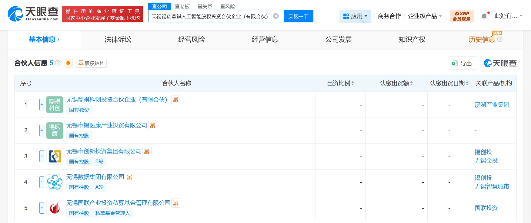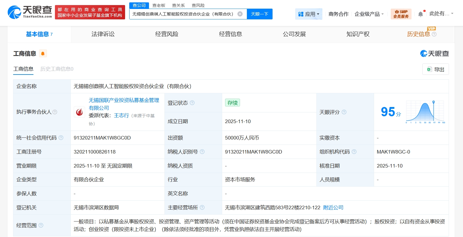雷达财经讯,天眼查工商信息显示,近日,无锡锡创鼎祺人工智能股权投资合伙企业(有限合伙)成立,执行事务合伙人为无锡国联产业投资私募基金管理有限公司,出资额5亿人民币,经营范围为以私募基金从事股权投资、投资管理、资产管理等活动,股权投资,以自有资金从事投资活动,创业投资。合伙人信息显示,该合伙企业由无锡市创新投资集团有限公司、无锡鼎祺科创投资合伙企业(有限合伙)、无锡数据集团有限公司等共同出资。