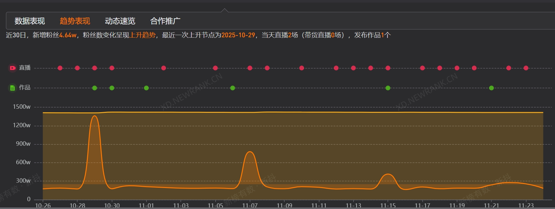 第三方数据显示,k总视频平台现有粉丝数为1414.1万,过去30日涨粉4.64万。此外,其1-20s视频广告报价为60万元,21-60s视频广告报价为70万元,60s以上视频广告报价为80万元。