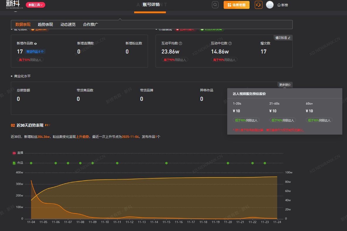 第三方数据显示,“瑞安市莘塍富强不锈钢制品厂”视频平台账号近30日涨粉204.36万。此外,其账号1-20s、21-60s、60s以上视频广告预估报价均为10元。
