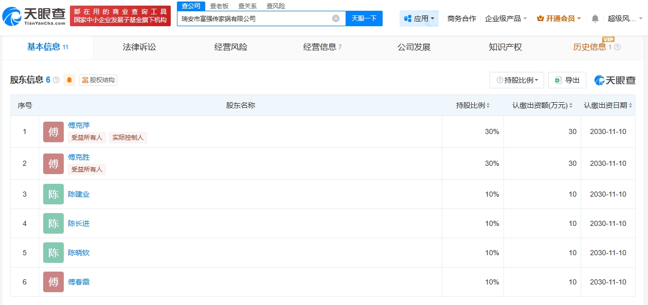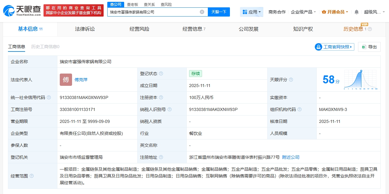 天眼查App显示,近日,瑞安市富强传家锅有限公司成立,法定代表人为传家锅老板傅克萍,注册资本100万人民币,经营范围包括金属制日用品制造、厨具卫具及日用杂品零售、厨具卫具及日用杂品批发等。股东信息显示,该公司由傅克萍、傅克胜等共同持股。