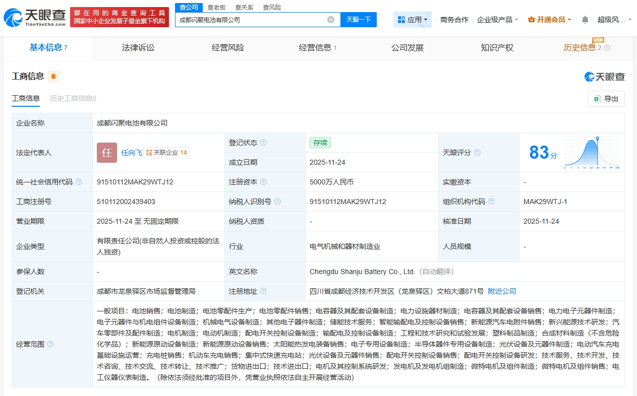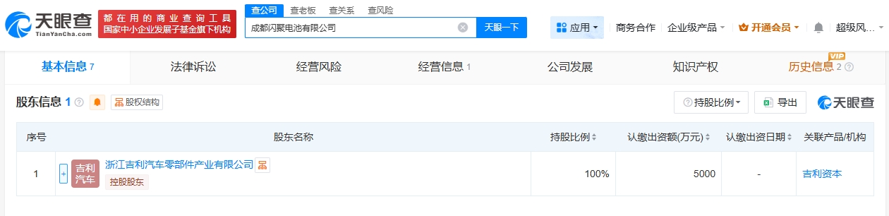 雷达财经讯,天眼查App显示,近日,成都闪聚电池有限公司成立,法定代表人为任向飞,注册资本5000万人民币,经营范围包括电池销售、电池制造、电池零配件生产、电池零配件销售等。股东信息显示,该公司由浙江吉利汽车零部件产业有限公司全资持股。