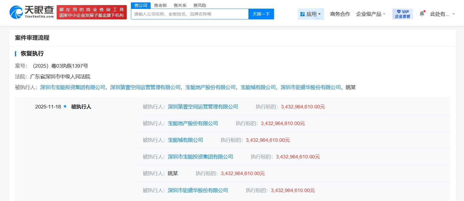 雷达财经讯,天眼查App显示,近日,深圳市宝能投资集团有限公司新增3则恢复执行信息,执行标的合计45亿余元,被执行人还包括姚振华、宝能地产股份有限公司等,执行法院为广东省深圳市中级人民法院。