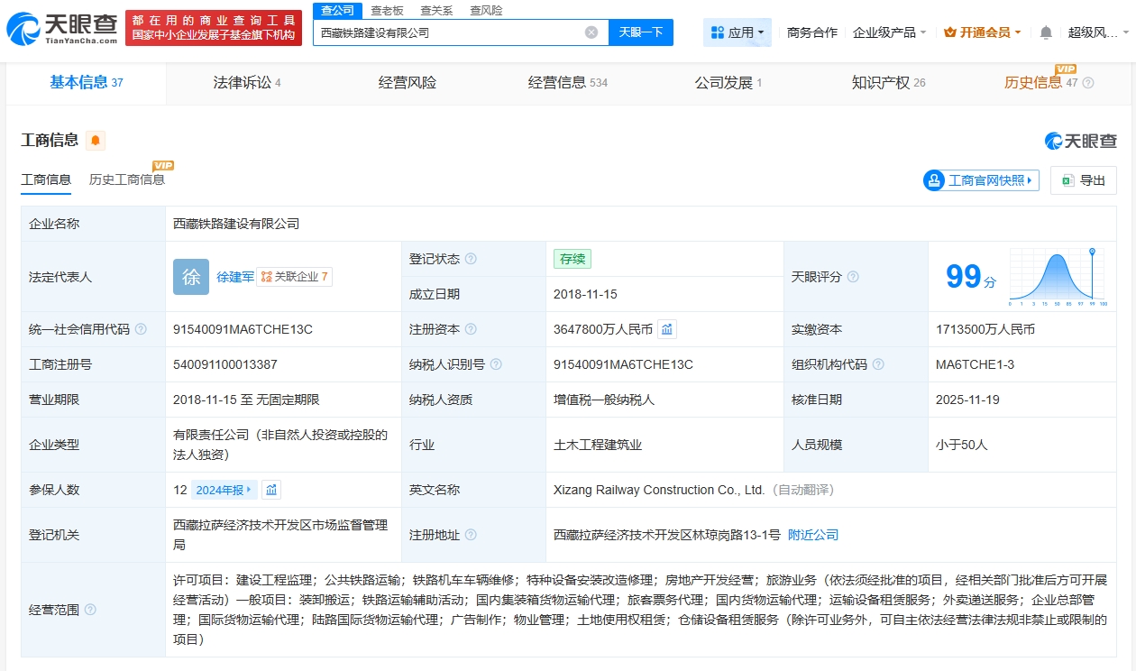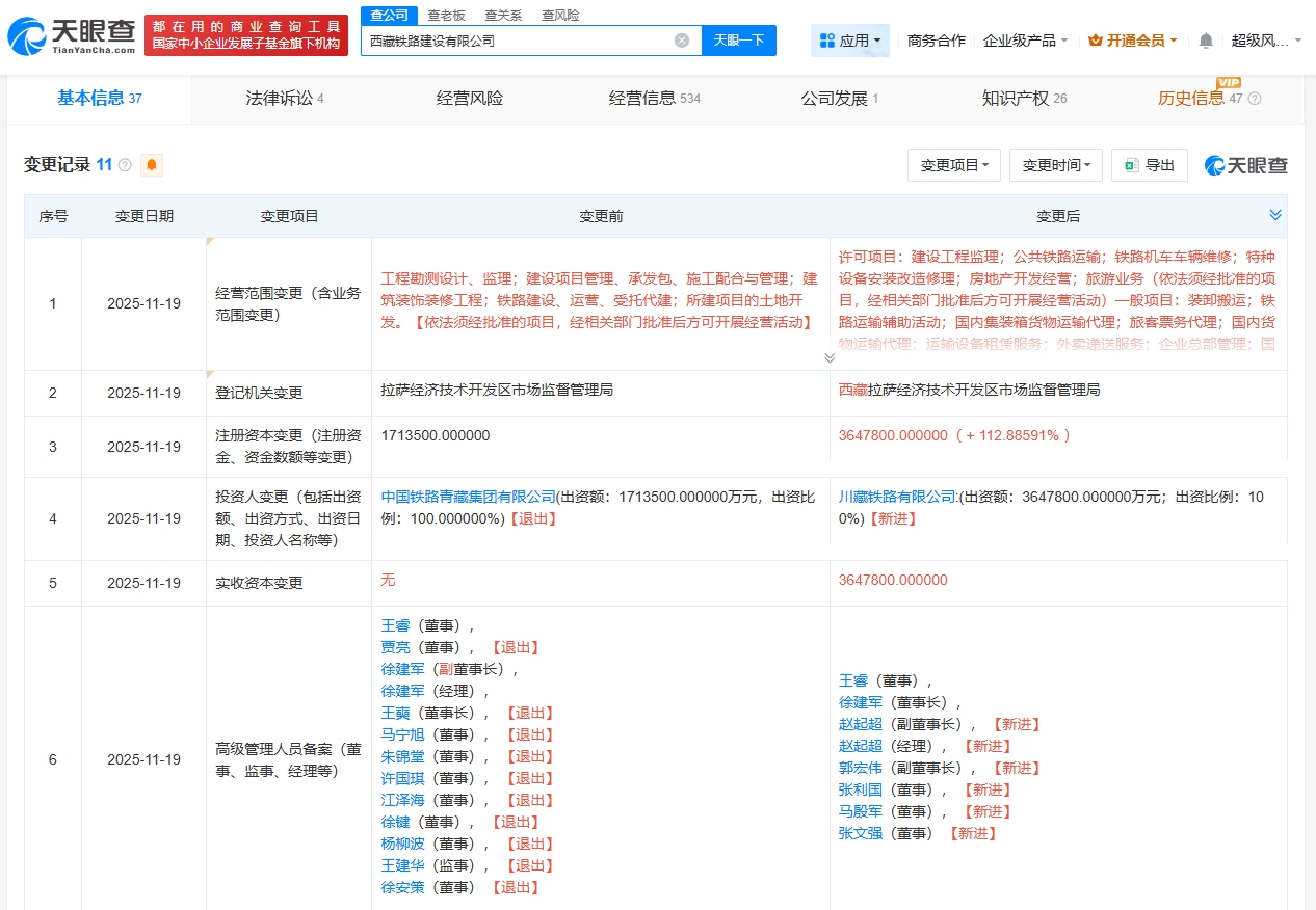 雷达财经讯,天眼查工商信息显示,近日,西藏铁路建设有限公司发生工商变更,原股东中国铁路青藏集团有限公司退出,新增川藏铁路有限公司为全资股东;注册资本由171.35亿人民币增至364.78亿人民币,增幅约113%;王奭卸任董事长,由徐建军接任,同时多位高管发生变更。