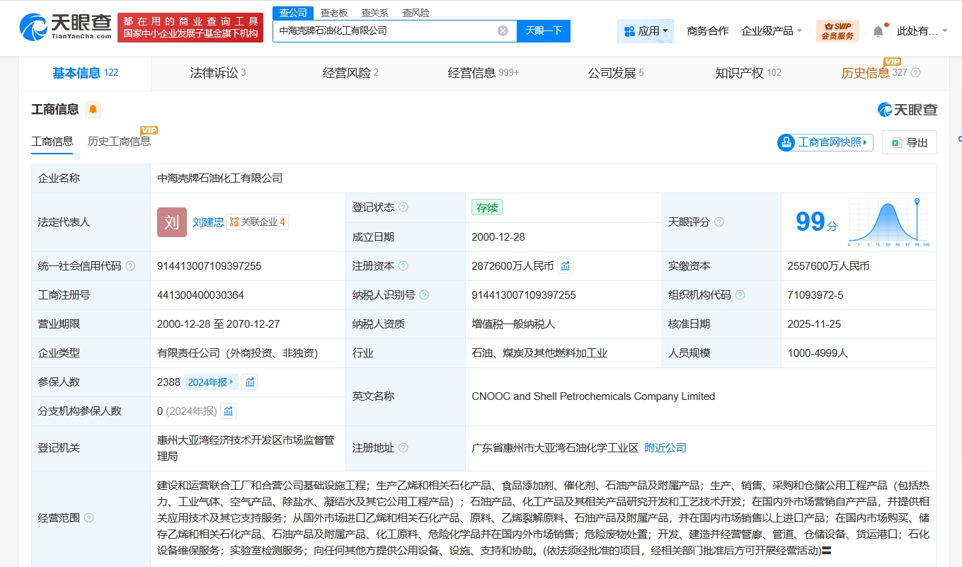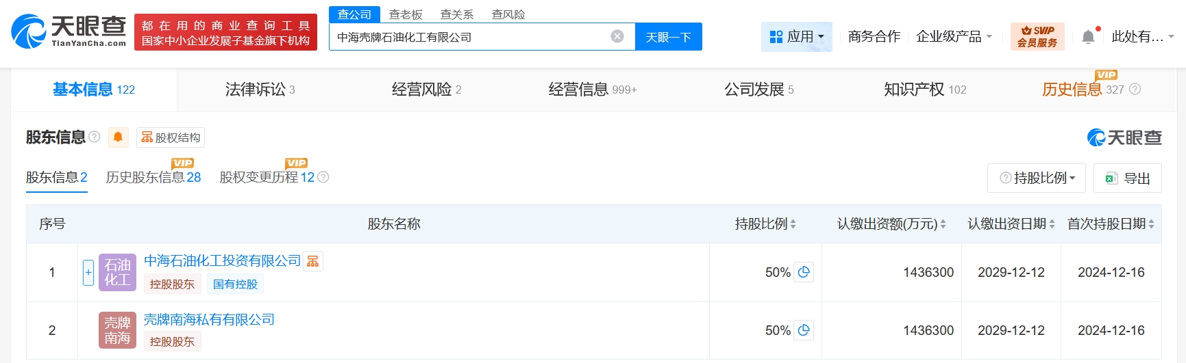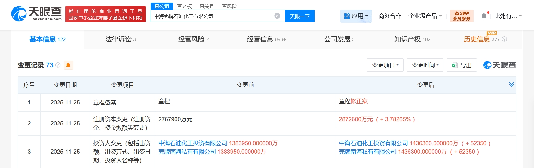 雷达财经讯,天眼查工商信息显示,近日,中海壳牌石油化工有限公司发生工商变更,注册资本由约276.8亿人民币增至约287.3亿人民币,增幅约4%。