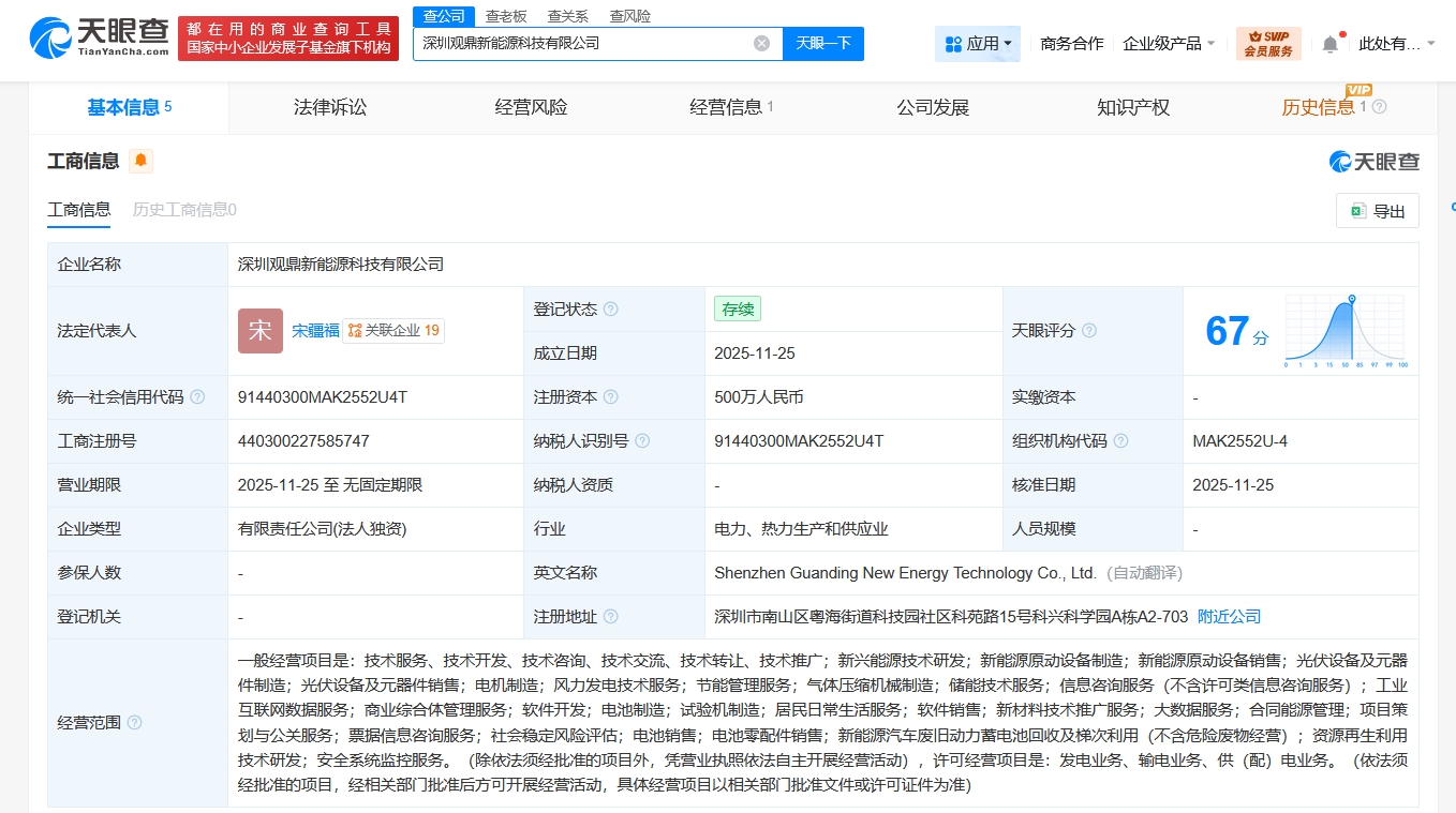雷达财经讯,天眼查App显示,近日,深圳观鼎新能源科技有限公司成立,法定代表人为宋疆福,注册资本500万人民币,经营范围含新兴能源技术研发、新能源原动设备制造、新能源原动设备销售、光伏设备及元器件制造、光伏设备及元器件销售、电机制造、风力发电技术服务、节能管理服务等。股权全景穿透图显示,该公司由赣锋锂业(002460)旗下深圳易储数智能源集团有限公司全资持股。