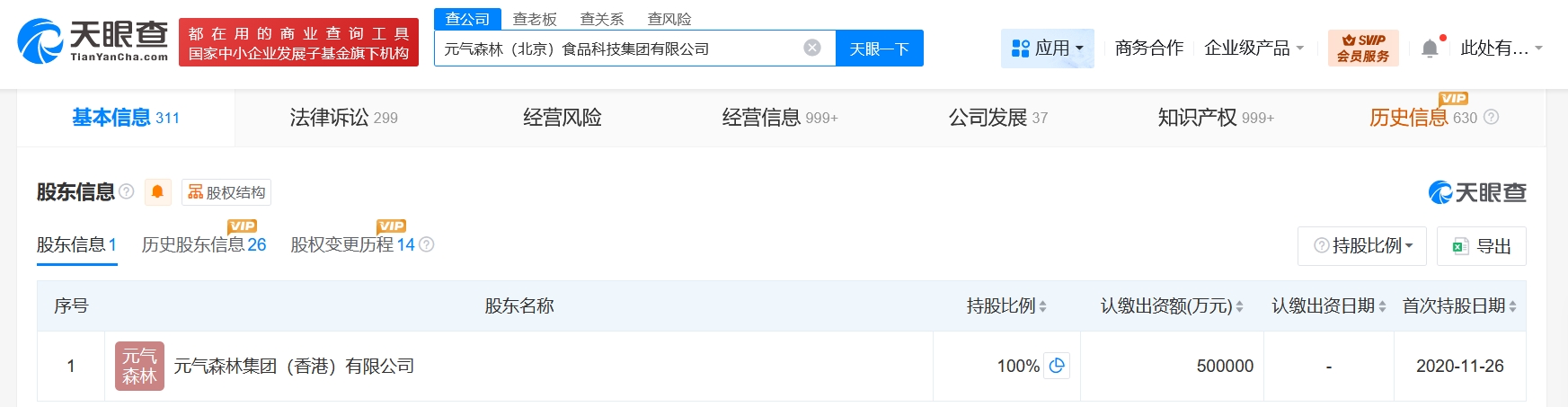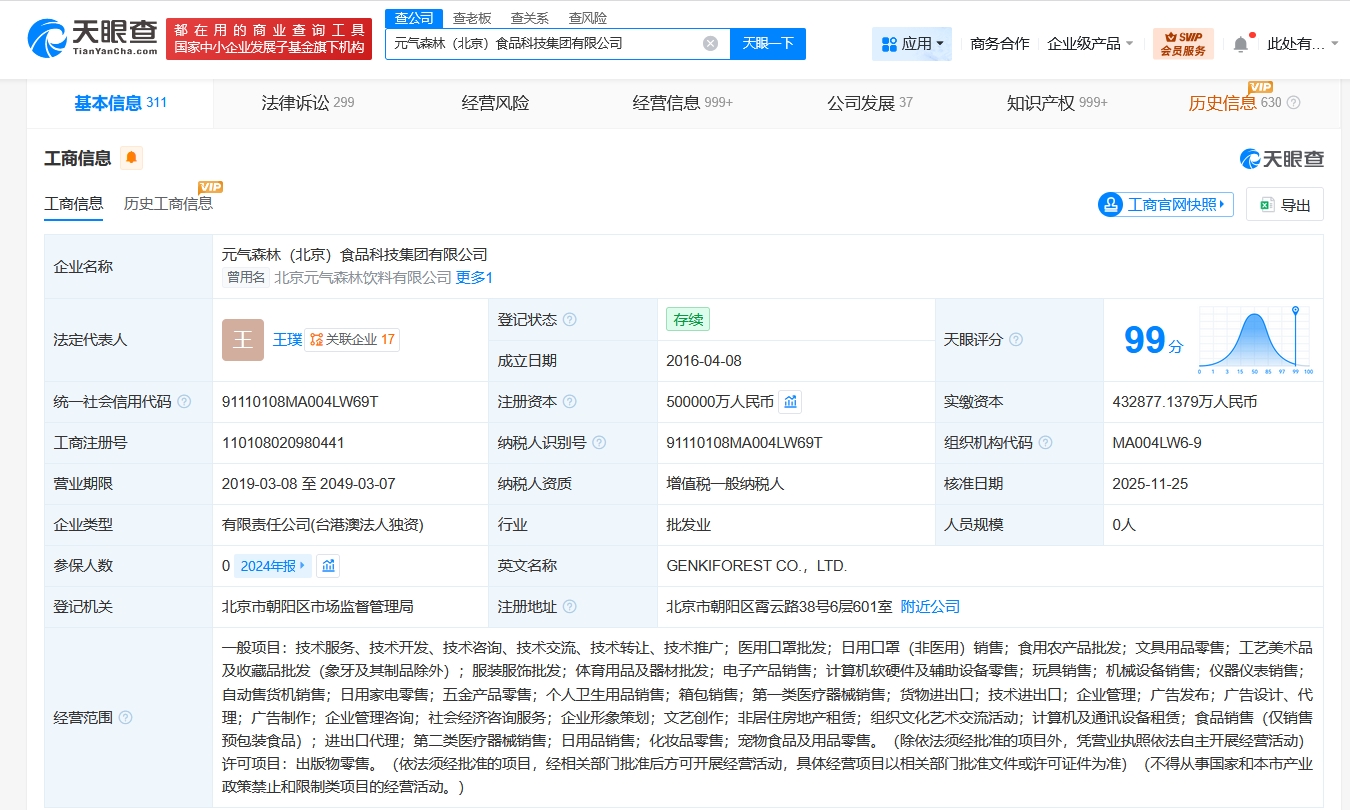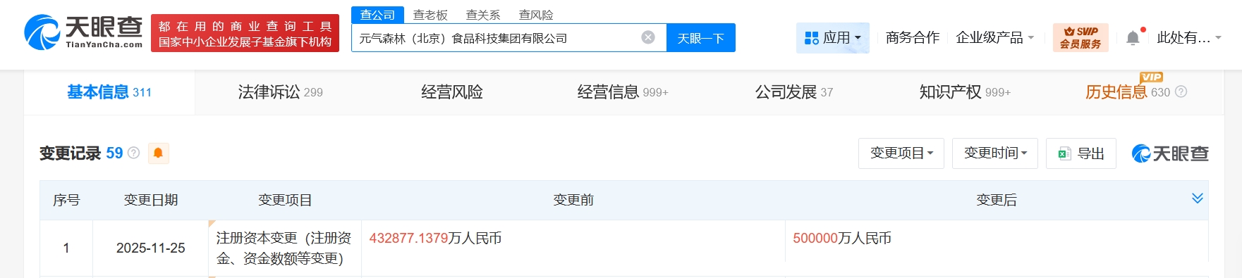 雷达财经讯,天眼查工商信息显示,近日,元气森林(北京)食品科技集团有限公司发生工商变更,注册资本由约43.3亿人民币增至50亿人民币,增幅约15.5%。