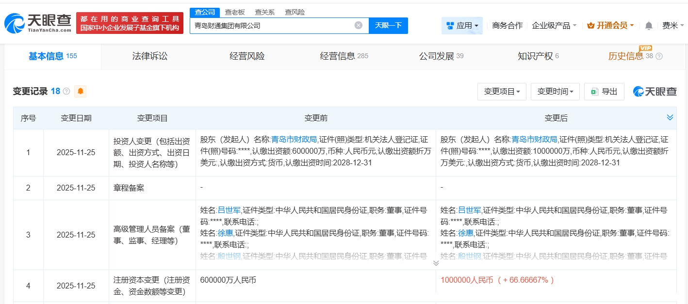 雷达财经讯,天眼查工商信息显示,近日,青岛财通集团有限公司发生工商变更,注册资本由60亿人民币增至100亿人民币,增幅约67%。