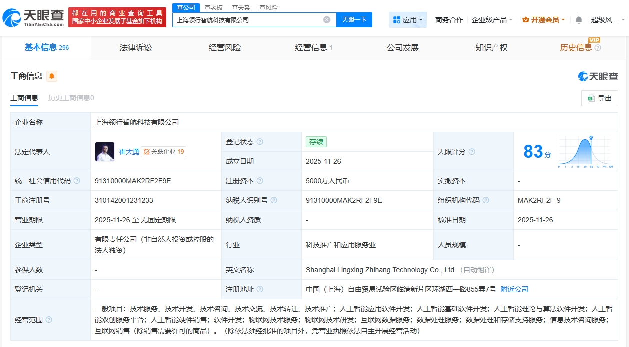 雷达财经讯,天眼查App显示,近日,上海领行智航科技有限公司成立,法定代表人为崔大勇,注册资本5000万人民币,经营范围包括人工智能应用软件开发、人工智能基础软件开发、人工智能理论与算法软件开发等。股权全景穿透图显示,该公司由T3出行旗下南京领行汽车服务有限公司全资持股。