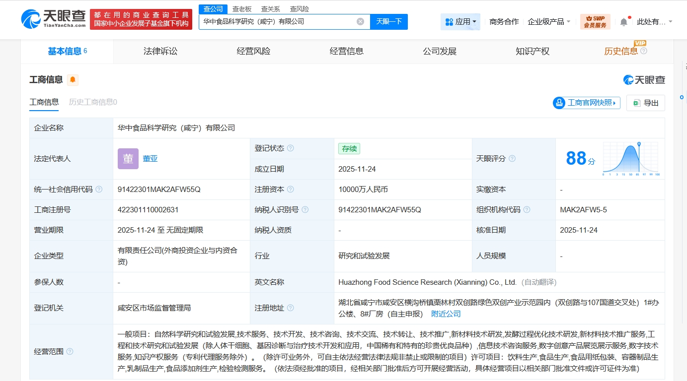 雷达财经讯,天眼查App显示,近日,华中食品科学研究(咸宁)有限公司成立,法定代表人为董亚,注册资本1亿人民币,经营范围含自然科学研究和试验发展、新材料技术研发、发酵过程优化技术研发、新材料技术推广服务、工程和技术研究和试验发展、饮料生产、食品生产等,由咸宁高新产业发展有限公司、元气森林(北京)食品科技集团有限公司分别持股90%、10%。