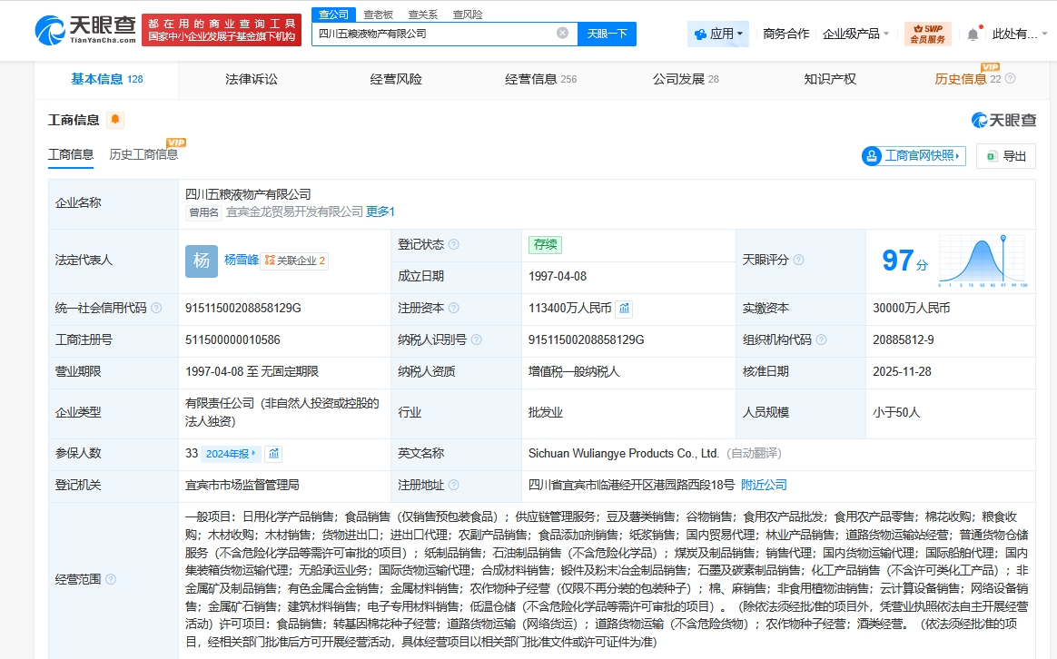 该公司成立于1997年4月,法定代表人为杨雪峰,经营范围含日用化学产品销售、食品销售、供应链管理服务、货物进出口、进出口代理、国内贸易代理、普通货物仓储服务、道路货物运输、酒类经营等。股东信息显示,该公司由四川省宜宾五粮液集团有限公司全资持股。