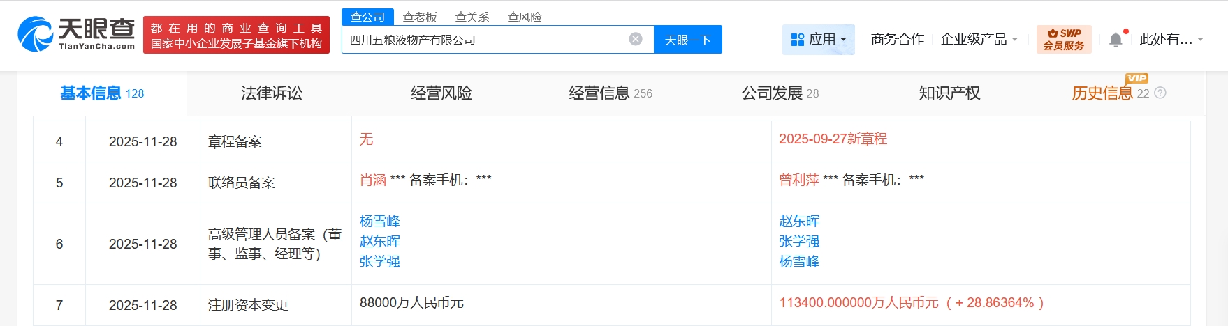 雷达财经讯,天眼查工商信息显示,近日,四川五粮液物产有限公司发生工商变更,注册资本由8.8亿人民币增至11.34亿人民币,增幅约29%。