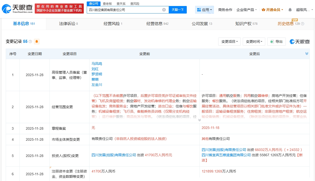 雷达财经讯,天眼查工商信息显示,近日,四川航空集团有限责任公司发生工商变更,新增四川省宜宾五粮液集团有限公司为股东,注册资本由4.17亿人民币增至约12.19亿人民币。