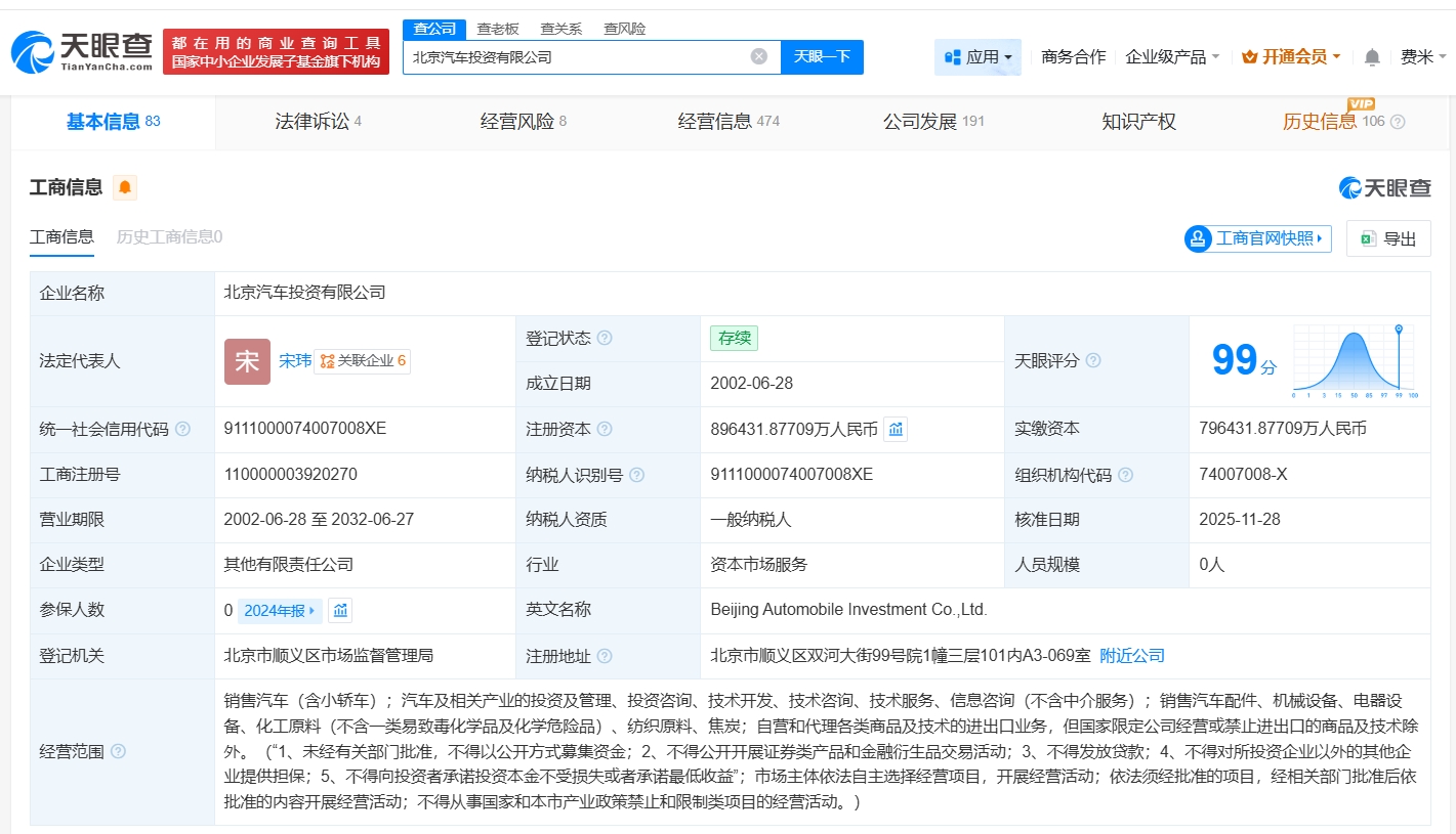 雷达财经讯,天眼查工商信息显示,近日,北京汽车投资有限公司发生工商变更,注册资本由约79.6亿人民币增至约89.6亿人民币,增幅约13%。