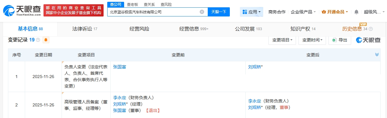 雷达财经讯,天眼查App显示,近日,北京蓝谷极狐汽车科技有限公司发生工商变更,张国富卸任法定代表人、董事,由刘观桥接任并兼任经理。