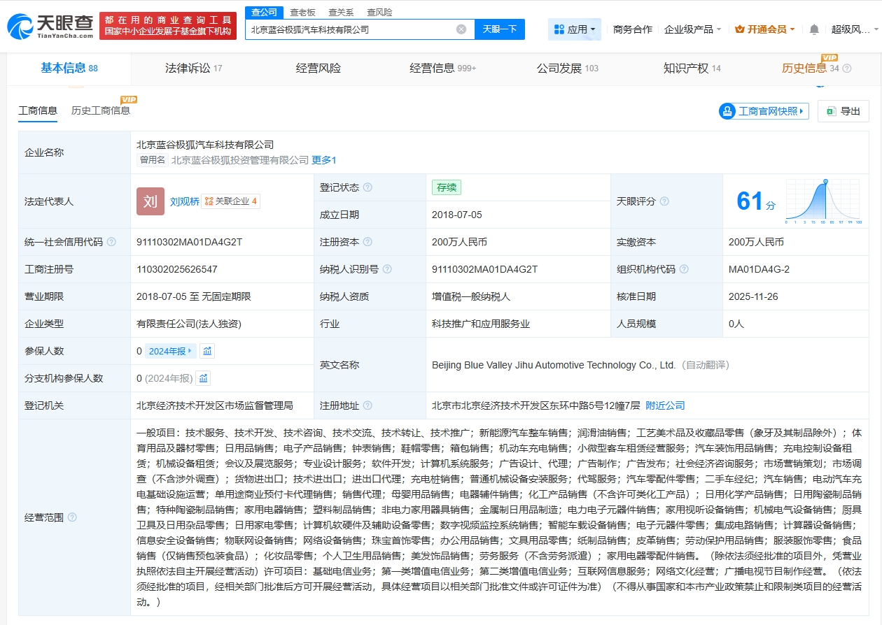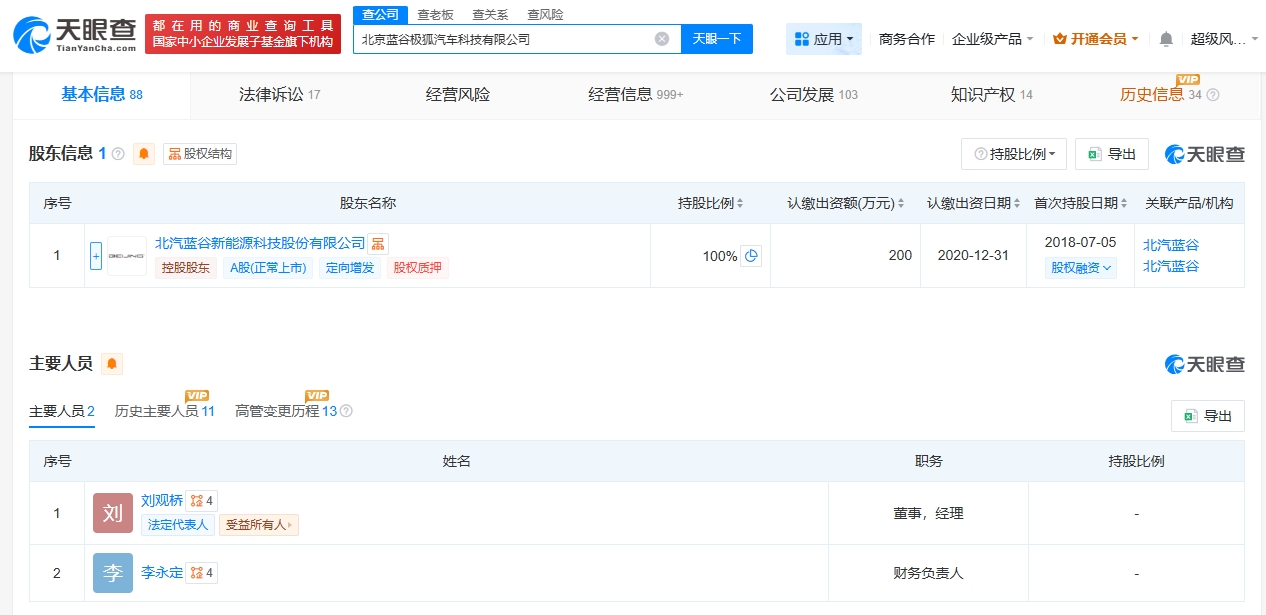 该公司成立于2018年7月,注册资本200万人民币,经营范围包括新能源汽车整车销售、机动车充电销售、小微型客车租赁经营服务、二手车经纪等。股东信息显示,该公司由北汽蓝谷(600733)全资持股。