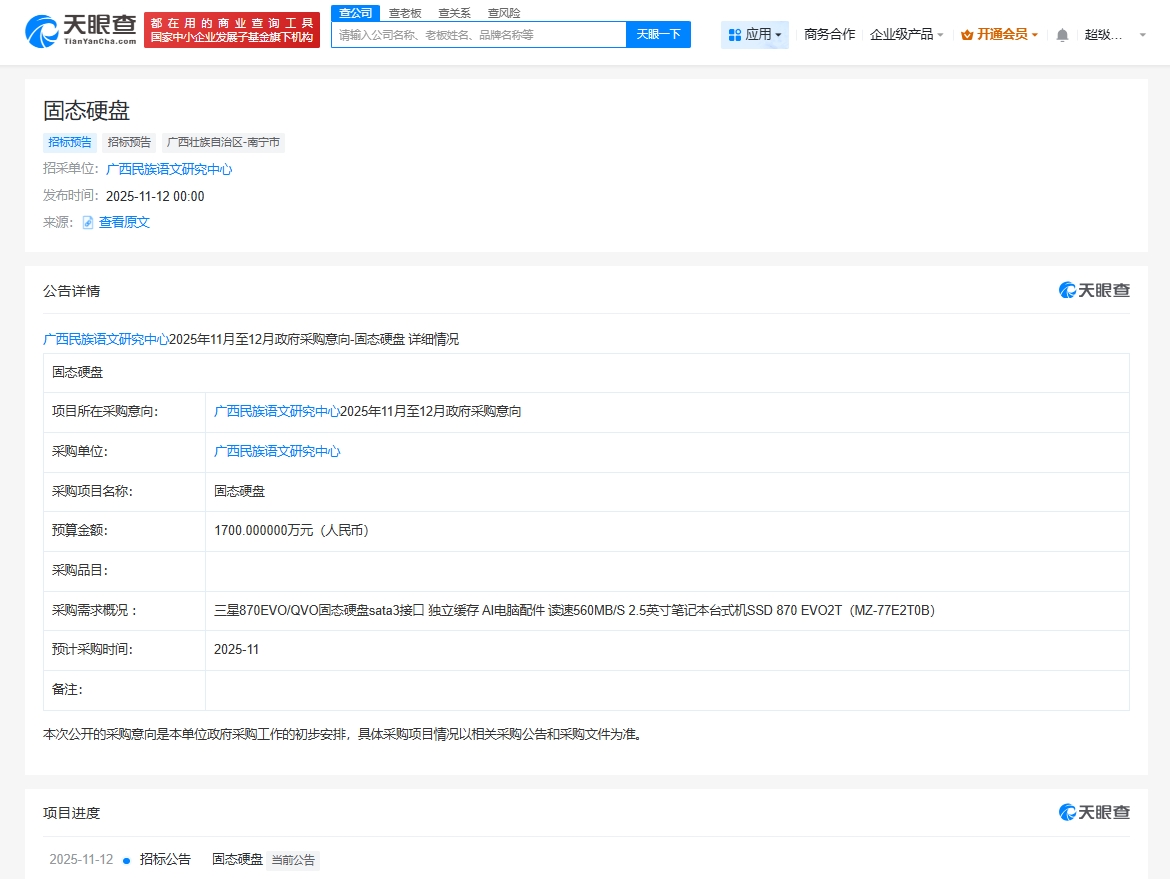 值得注意的是,广西民族语文研究中心11月还公布了便携式计算机和固态硬盘采购意向,预算金额分别为39000万元(人民币)、1700万元(人民币)。
