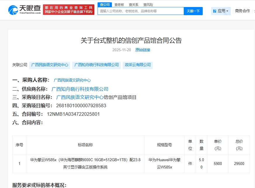 天眼查招投标信息显示,广西民族语文研究中心曾公布“关于台式整机的信创产品馆合同公告”。公告显示,该合同采购了5台华为擎云W585x电脑,单价为5900元,总价为2.95万元。