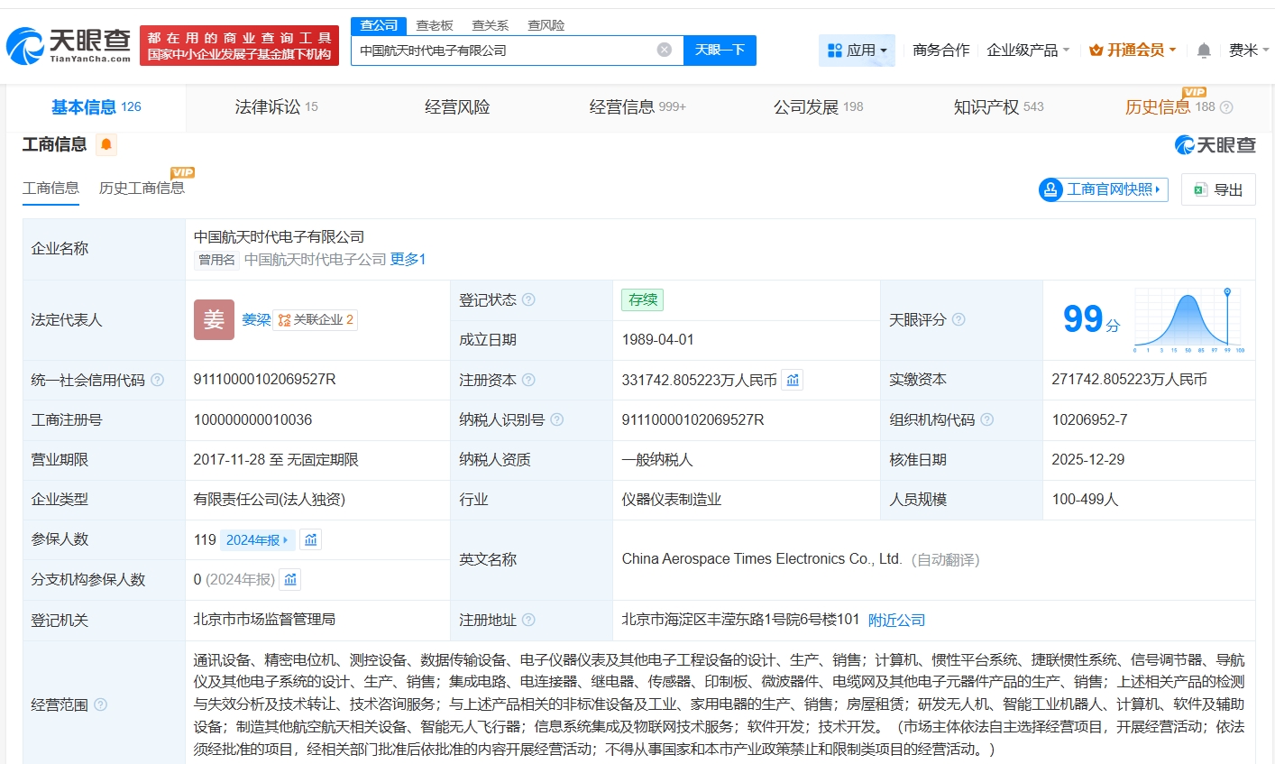 雷达财经讯,天眼查App显示,近日,中国航天时代电子有限公司发生工商变更,注册资本由约27.2亿人民币增至约33.2亿人民币,增幅约22%。