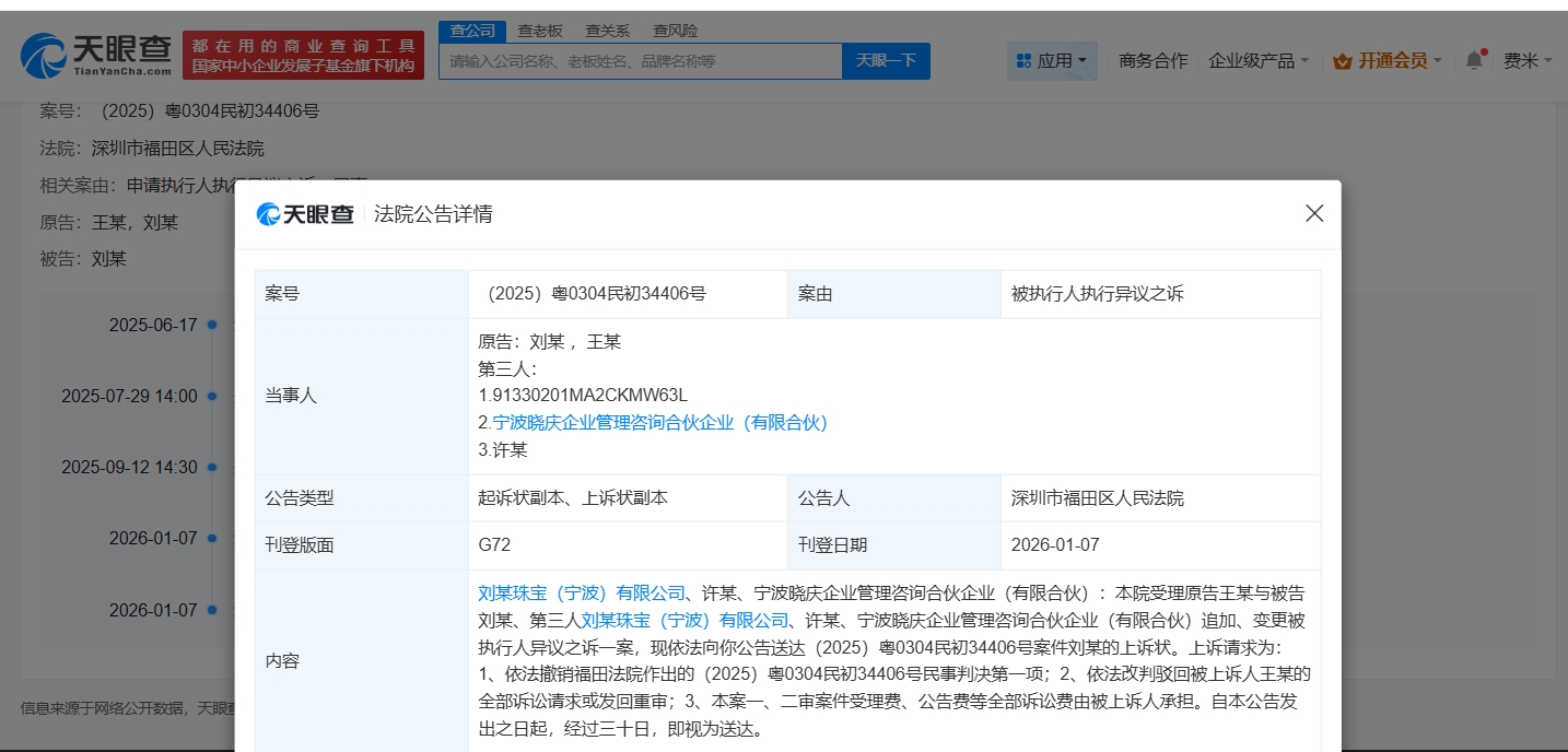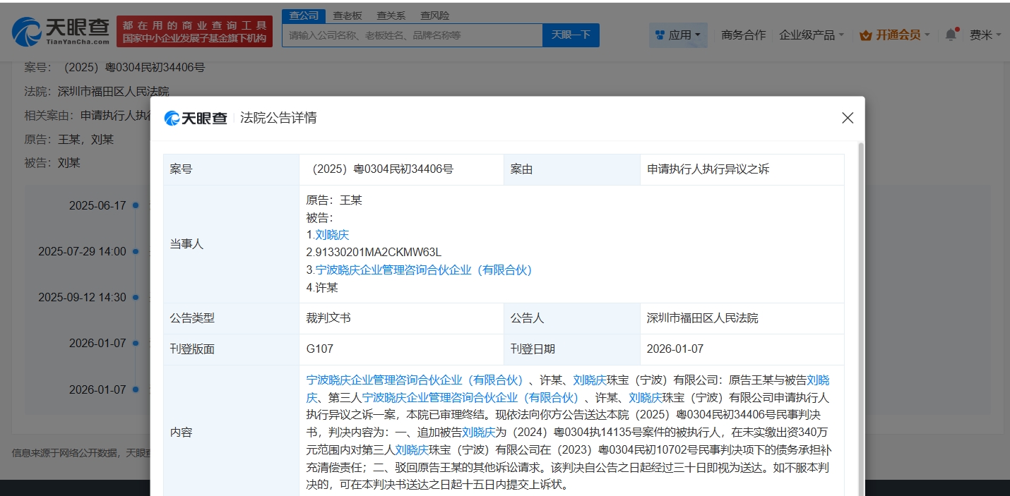 雷达财经讯,天眼查天眼风险信息显示,1月7日,深圳市福田区人民法院向宁波晓庆企业管理咨询合伙企业(有限合伙)、许某、刘晓庆珠宝(宁波)有限公司公告送达原告王某与被告刘晓庆的申请执行人执行异议之诉一案的民事判决书,法院判决追加被告刘晓庆为(2024)粤0304执14135号案件的被执行人,在未实缴出资340万元范围内对第三人刘晓庆珠宝(宁波)有限公司在(2023)粤0304民初10702号民事判决项下的债务承担补充清偿责任,同时驳回原告王某的其他诉讼请求。