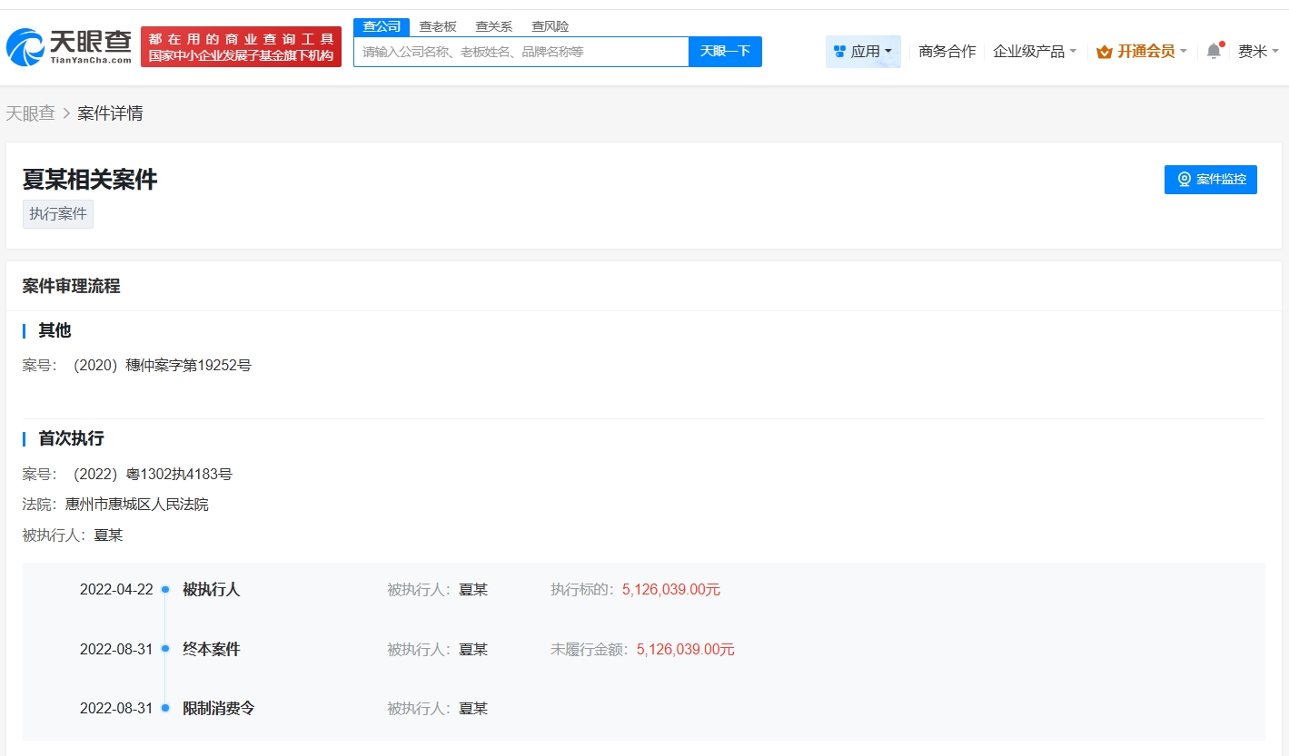 天眼查法律诉讼信息显示,夏凯旋(网红“狗头萝莉”本名)现存一则终本案件信息,未履行金额512万余元,案件流程信息显示,2022年4月,夏凯旋因该案被执行512万余元,2022年8月,夏凯旋因该案件被限制高消费,申请人为广州虎牙信息科技有限公司,涉及国内非涉外仲裁裁决案件。