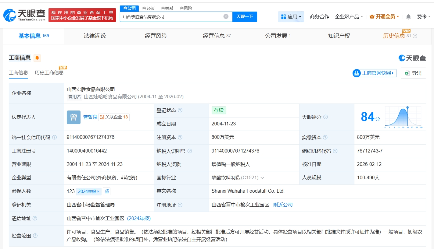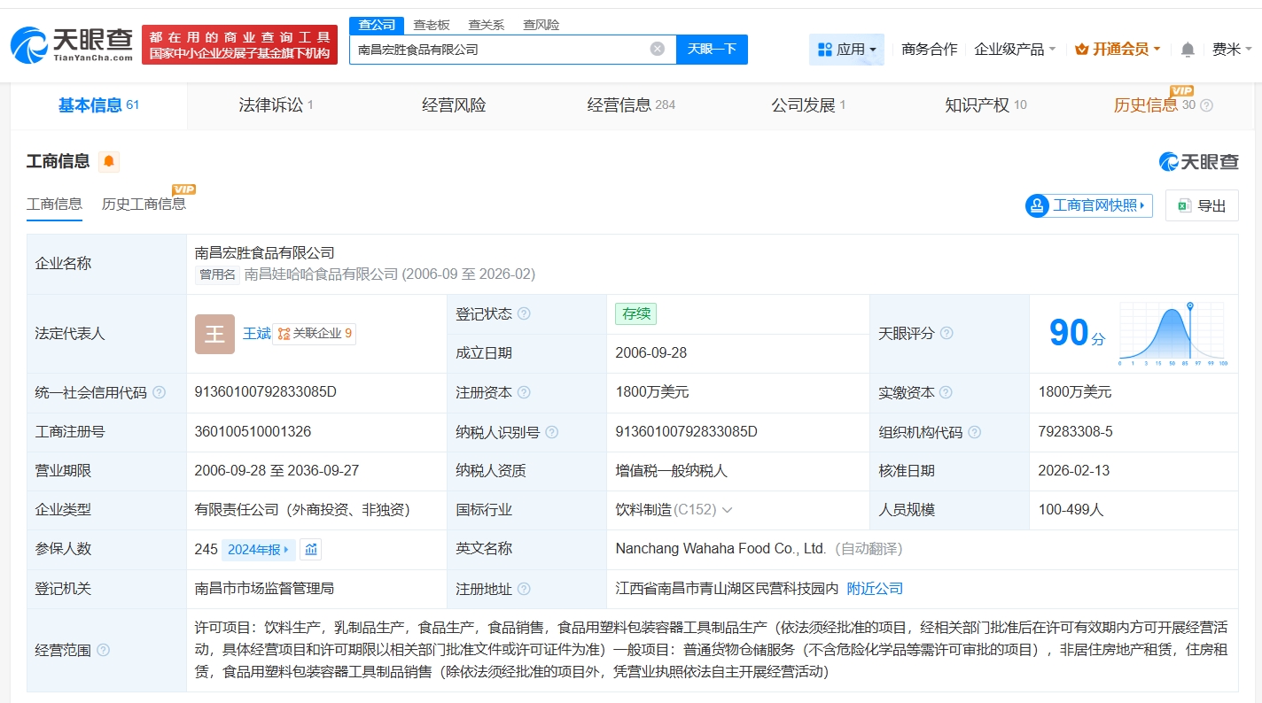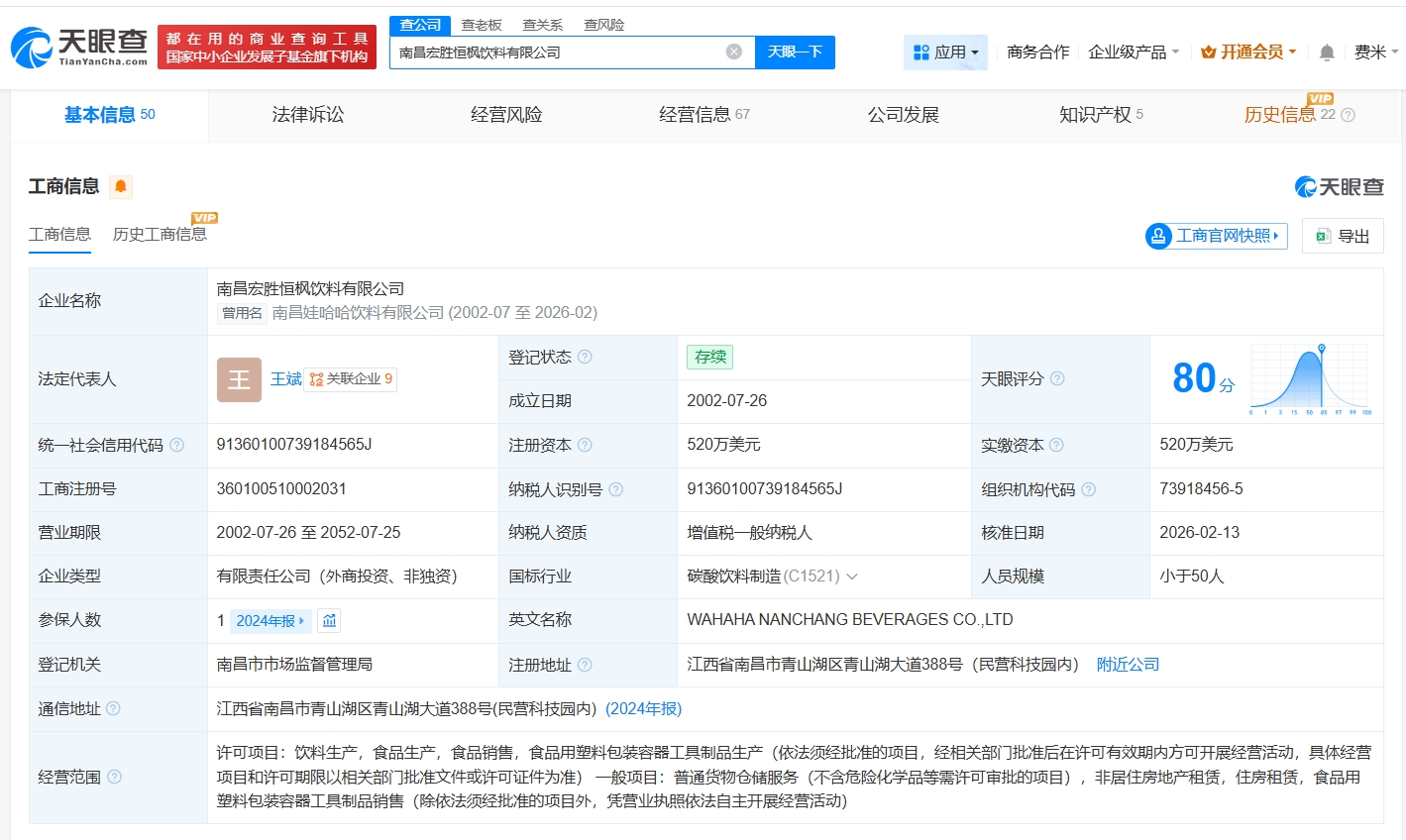 雷达财经讯,天眼查App显示,近日,南昌娃哈哈食品有限公司发生工商变更,企业名称变更为南昌宏胜食品有限公司。