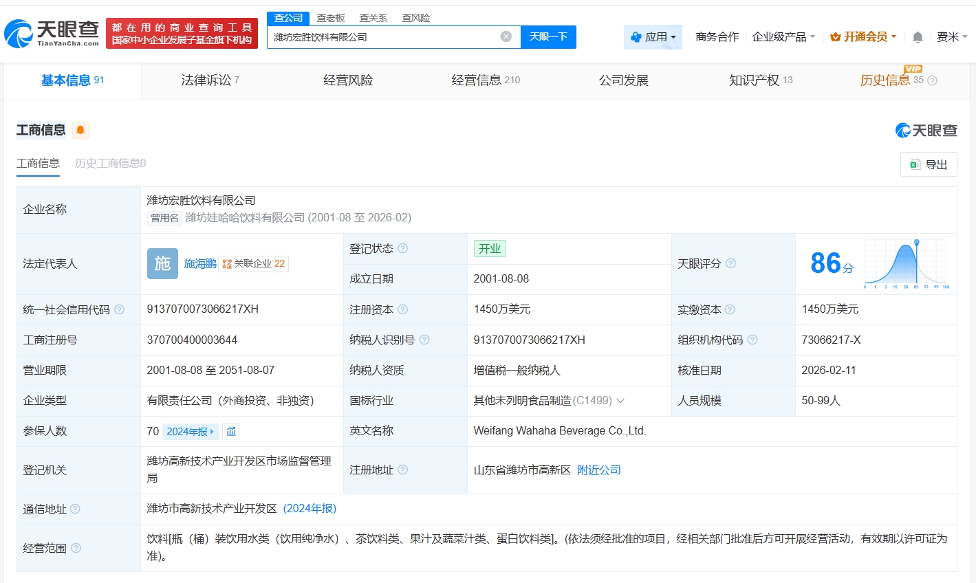 该公司成立于2006年9月,法定代表人为王斌,注册资本1800万美元,经营范围包括饮料生产、乳制品生产、食品生产等,由荣辉投资有限公司、丽水盛佳饮料有限公司共同持股。值得一提的是,近期,南昌宏胜恒枫饮料有限公司、山西宏胜食品有限公司、潍坊宏胜饮料有限公司、潍坊宏胜乳品有限公司均完成更名。
