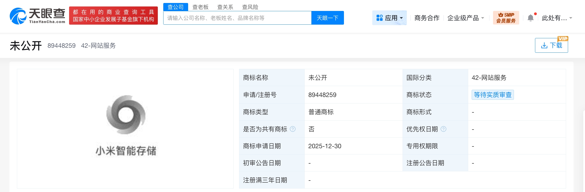 雷达财经讯,天眼查知识产权信息显示,近期,小米科技有限责任公司申请注册多枚“小米智能存储”商标,国际分类包括科学仪器、通讯服务、网站服务等,当前商标状态均为等待实质审查。