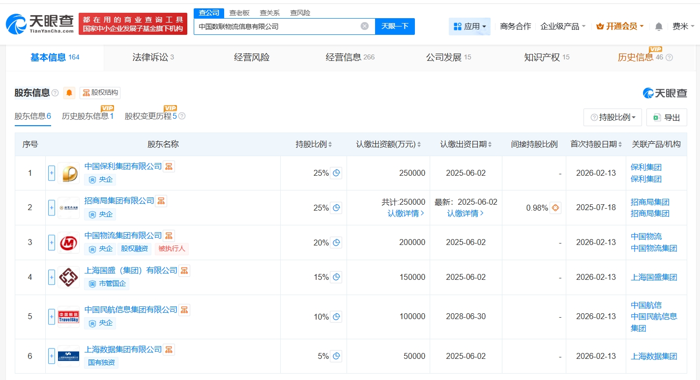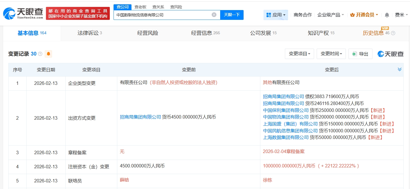 雷达财经讯,天眼查App显示,近日,中国数联物流信息有限公司发生工商变更,新增中国保利集团有限公司、中国物流集团有限公司等为股东,同时注册资本由4500万人民币增至100亿人民币,增幅约22122%。