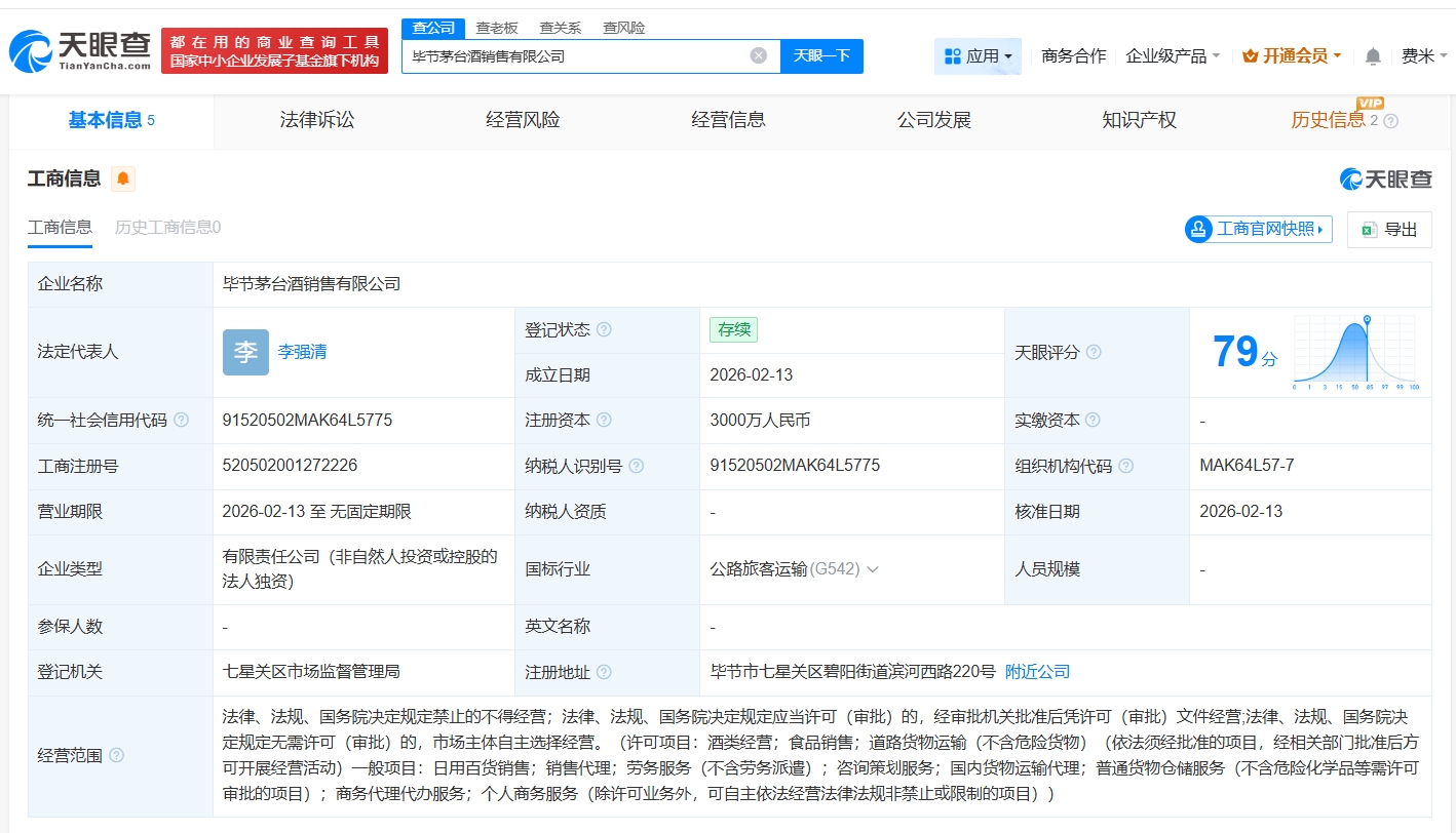 雷达财经讯,天眼查App显示,近日,毕节茅台酒销售有限公司成立,法定代表人为李强清,注册资本3000万人民币,经营范围包括酒类经营、食品销售、道路货物运输等,由贵州茅台(600519)旗下贵州茅台酒销售有限公司全资持股。