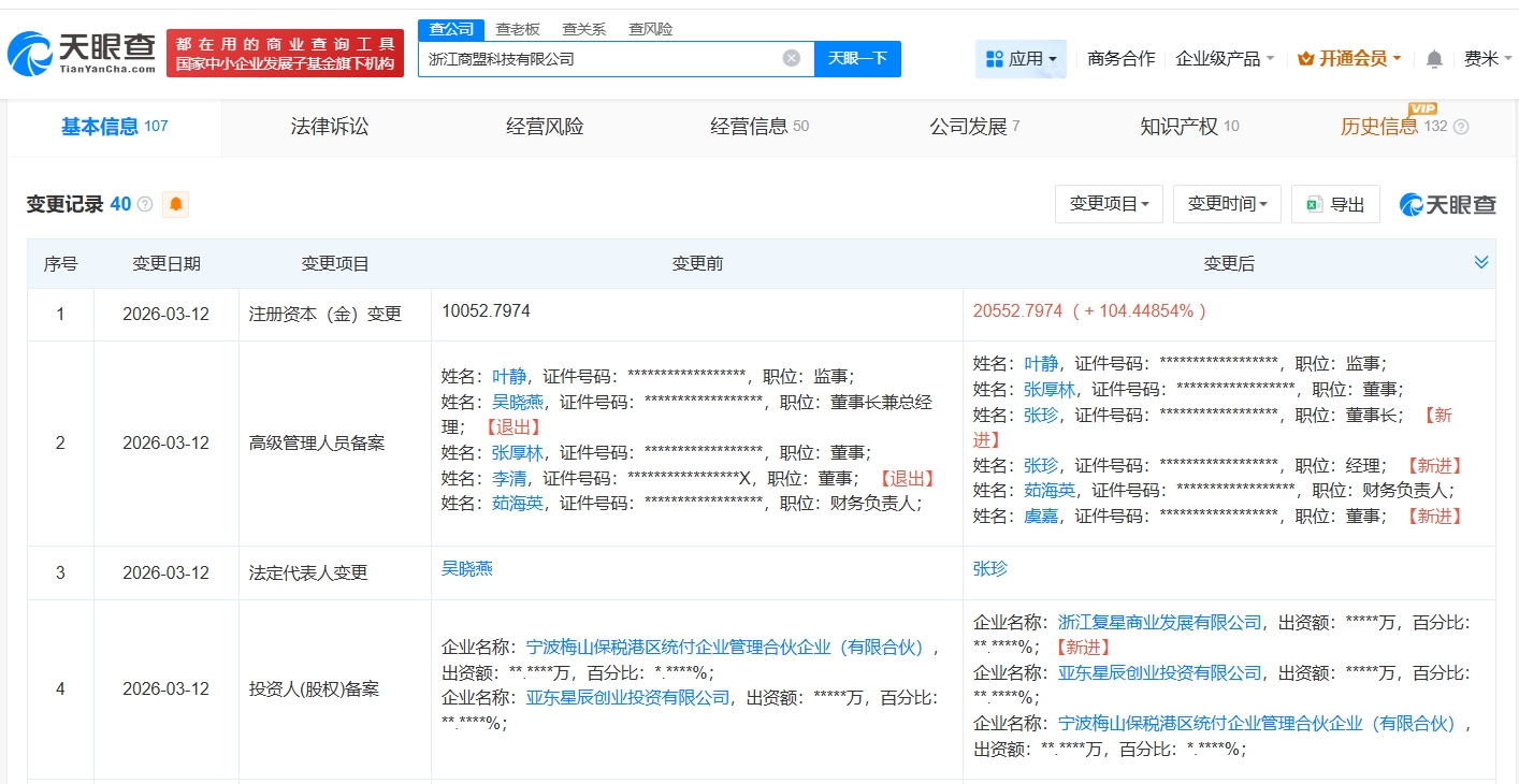 雷达财经讯,天眼查工商信息显示,近日,浙江商盟科技有限公司发生工商变更,新增复星集团旗下浙江复星商业发展有限公司为股东,注册资本由约1亿人民币增至约2.1亿人民币,增幅约104%,吴晓燕卸任法定代表人、董事长兼总经理,张珍接任法定代表人、董事长、经理。