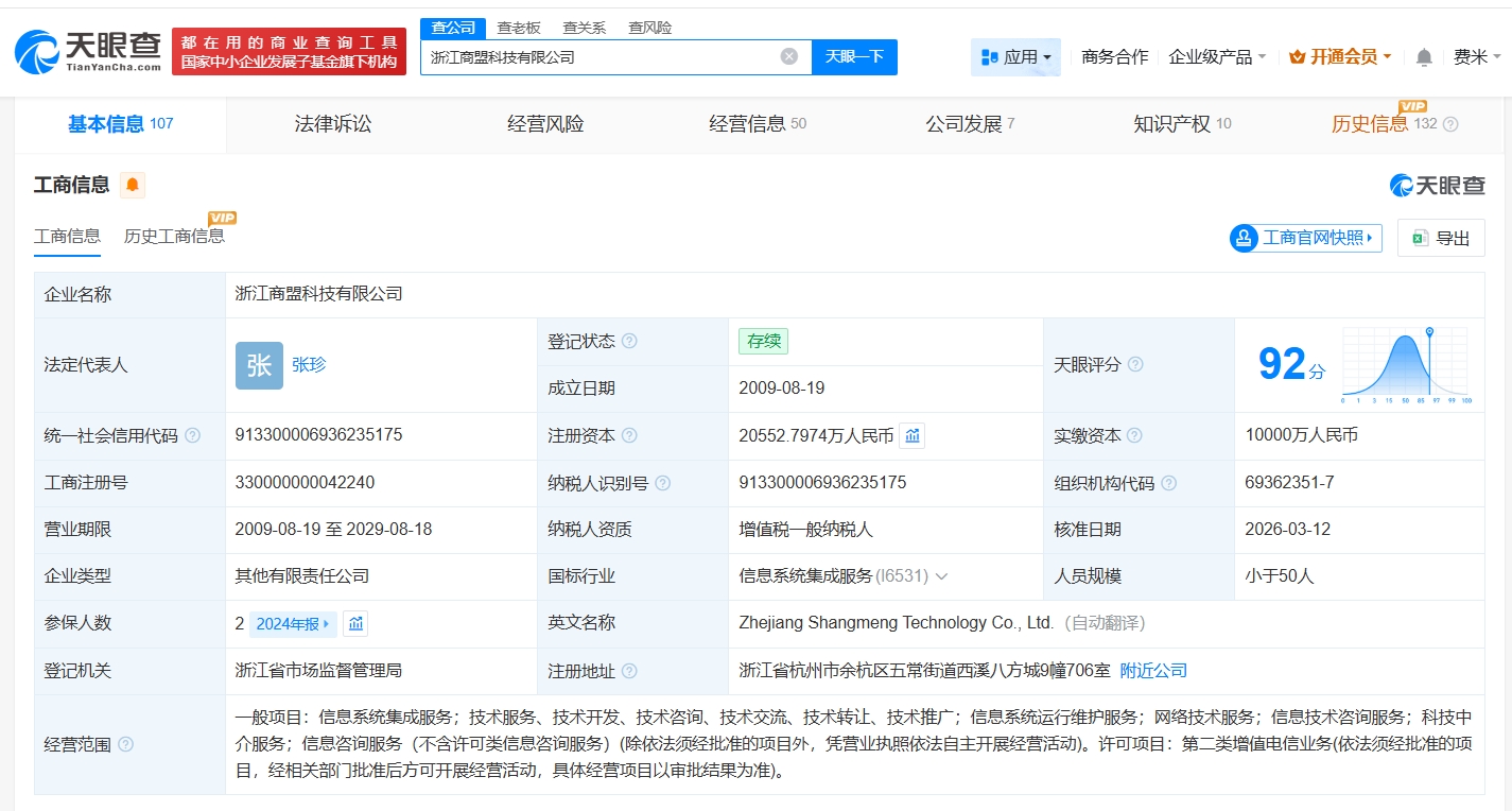 浙江商盟科技有限公司成立于2009年8月,经营范围包括信息系统集成服务、信息系统运行维护服务、网络技术服务等。股东信息显示,该公司现由亚东星辰创业投资有限公司、宁波梅山保税港区统付企业管理合伙企业(有限合伙)及上述新增股东共同持股。
