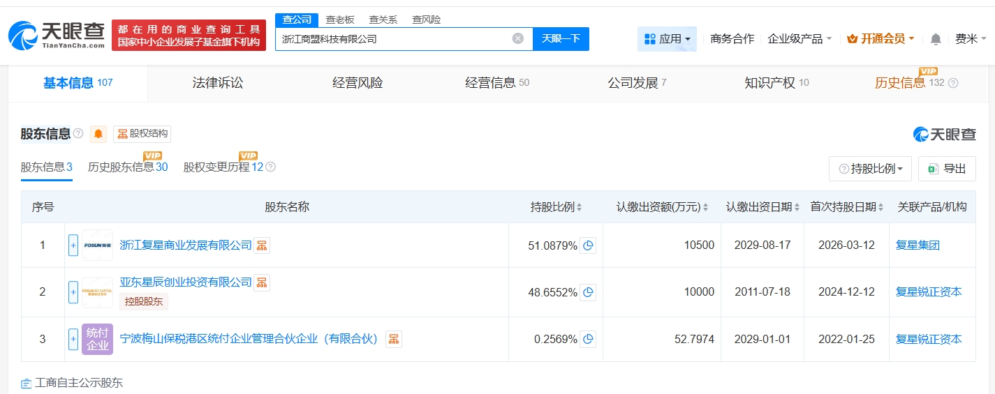 据媒体报道,此前复星国际发布公告称,其拟以现金1.05亿元认购商盟科技新增注册资本,成为商盟科技的最大股东。
