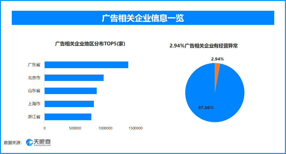 天眼查专业版数据显示,截至目前,我国拥有超1262.8万家广告相关企业。从地域分布上看,广东、北京以及山东三地,广告相关企业数量位居前列,分别拥有138万余家,97.4万余家以及85.7万余家。