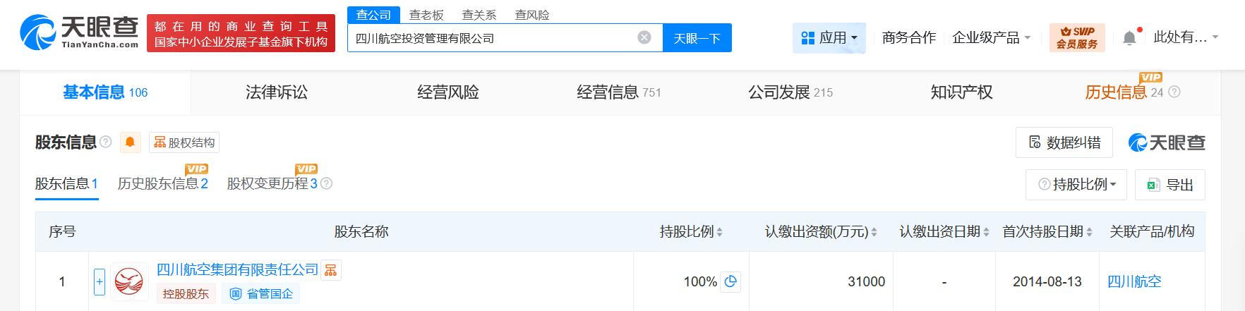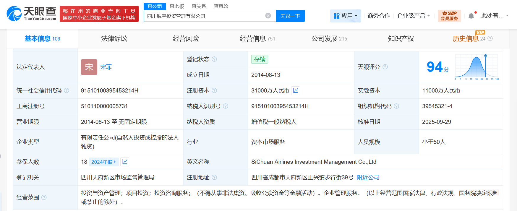 该公司成立于2014年8月,法定代表人为宋菲,经营范围为投资与资产管理,项目投资,投资咨询服务,企业管理服务。股东信息显示,该公司由四川航空集团有限责任公司全资持股。